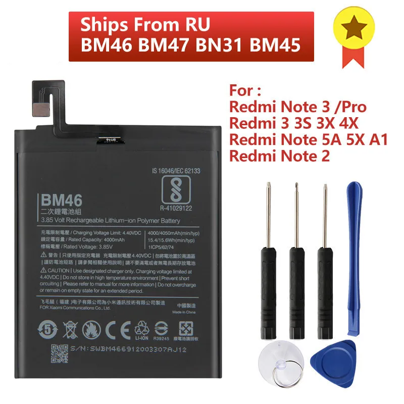 Сменный аккумулятор BM46 для Xiaomi Redmi Note 3, Note 3 Pro, Redmi 3, 3S, 3X, 4X, 3 pro, Note 2, Note 5A, Mi 5X, Mi A1, BN31, BM45