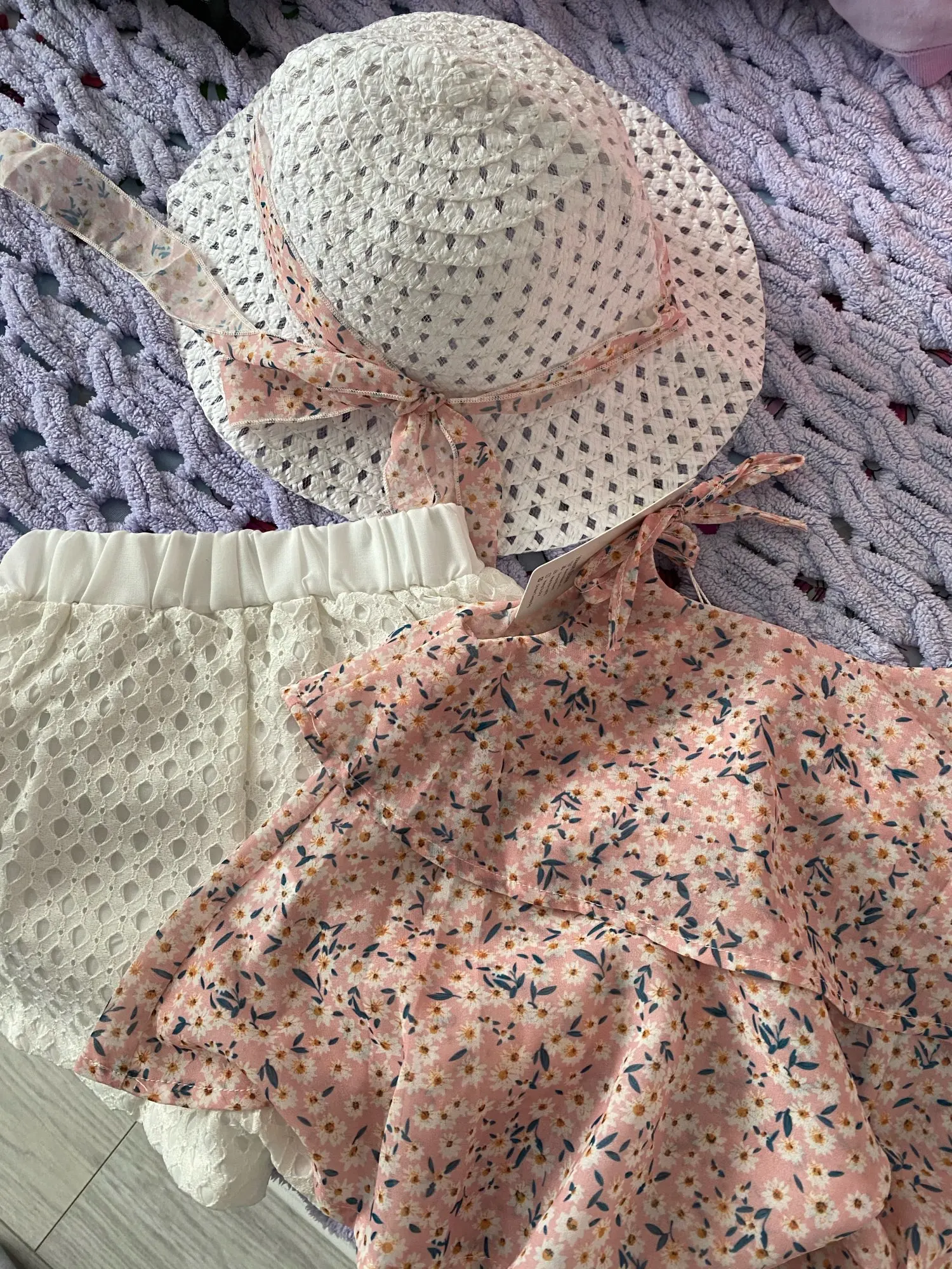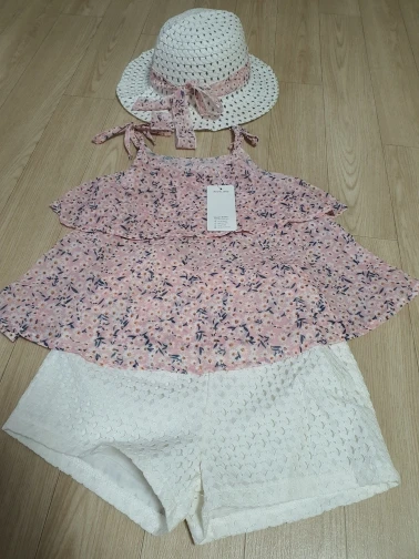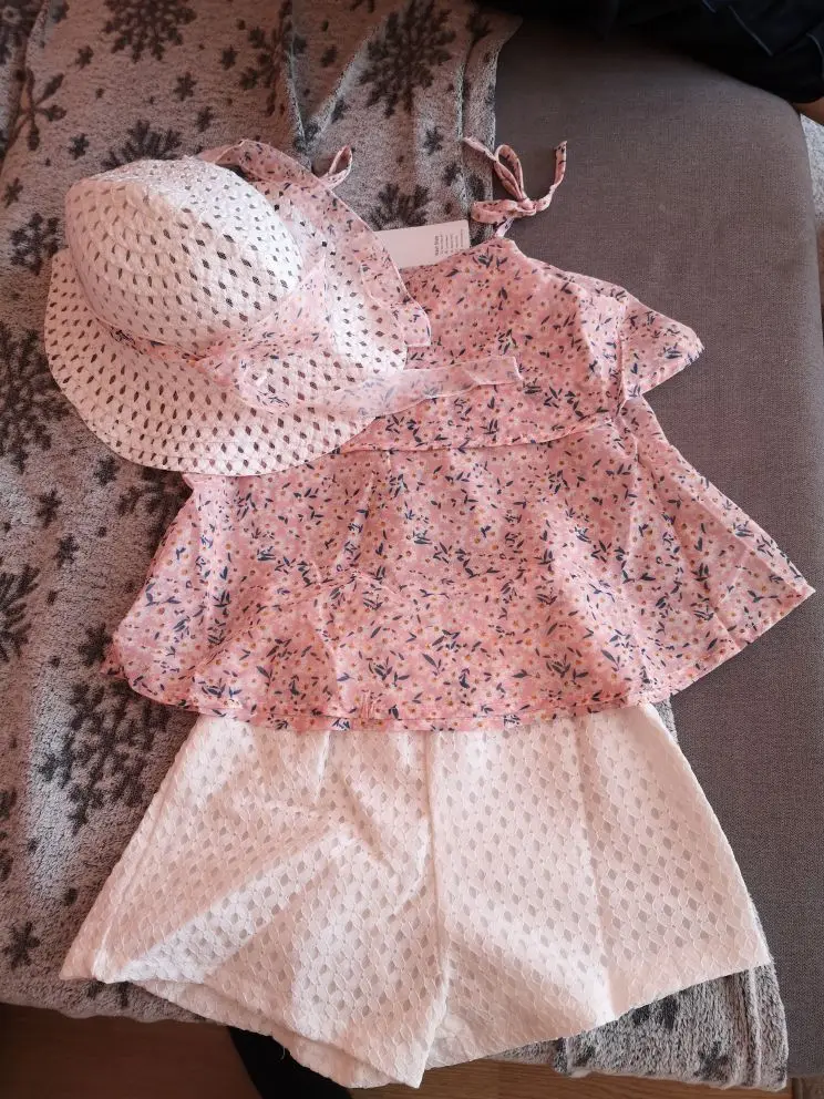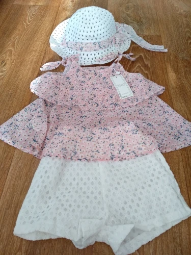 Очень милый костюмчик. Заказывала с запасом. Сейчас дочь носит 110-116. Этот костюм слегка большой. Но к лету, думаю, можно будет надевать. Ткань очень тоненькая, прям воздушная. Думаю, жарко в таком не будет даже при +30:) К телу очень приятная. Шортики с высокой талией. Ткань не тянется, но резинка очень мягкая. Подклад тоже. Шляпка пришла слегка измятой, но этого никак не избежать. Отпарила и нет проблем! Единственное, мне кажется, что она дочери слегка маловата:) Хотелось бы что бы она сидела поглубже. Но может это только особенности конкретно нашей головы. Покупкой ОЧЕНЬ довольна.