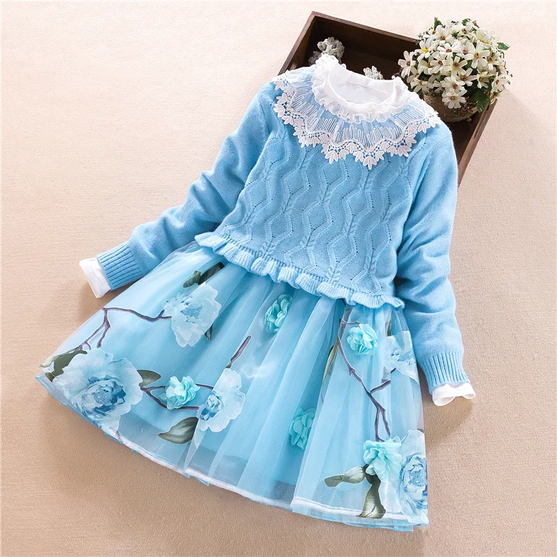 Платье для девочек, 2018 осенне-зимний пуловер для девочек, вязаное платье-свитер с длинным рукавом и цветочным принтом, детское трикотажное платье, DQ988