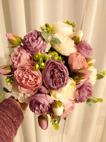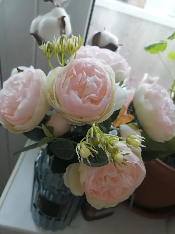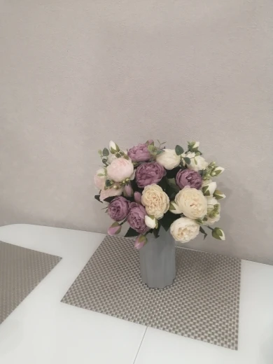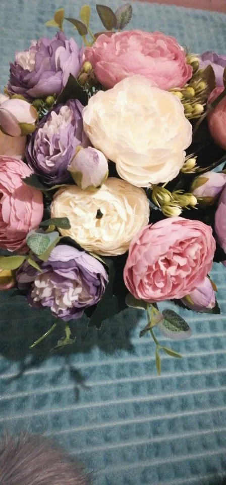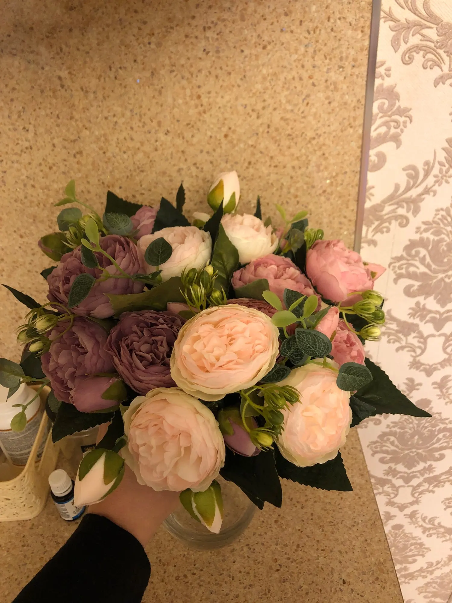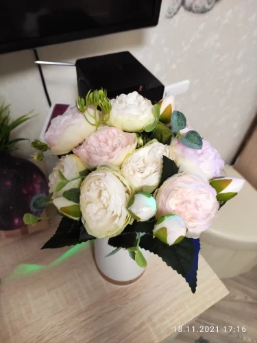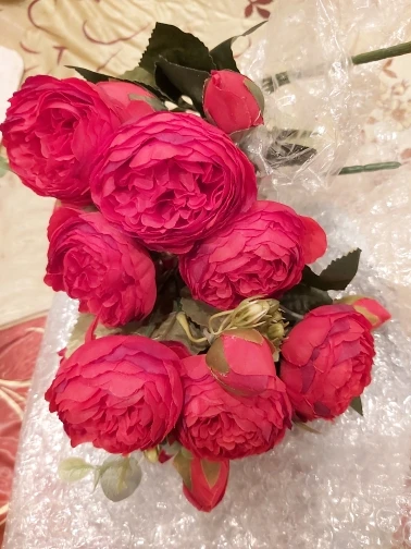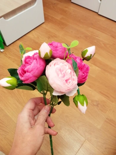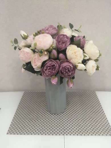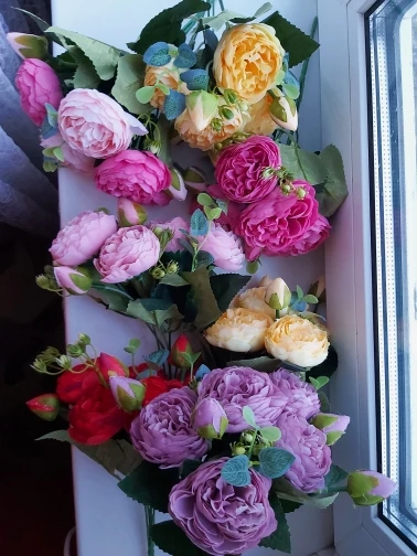 Пионы шикарные,лучше,чем я ожидала. Заказывала три веточки,на одной отвалился бутон,пока не нашла откуда именно,но вообще не критично. Смотрятся как живые. На удивление даже почти не помяты пришли,только кое-где листья заломлены,но в целом даже не пришлось отпаривать,о чем многие писали. Каждая веточка была в индивидуальной упаковке, пришли одной посылкой с другими заказами. С продавцом не общалась. Доставка в Ростовскую область около 3 недель. Дополнила букет хлопком и сухоцветами. Розовый пион снизу слегка с зеленцой. Брала цвета White, Pink Champagne и Purple.