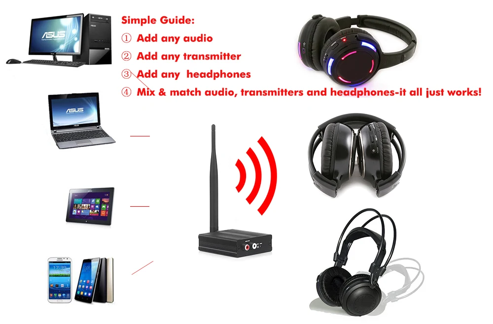 * ПодключениеДиапазон 500 мПередатчик на все, что вы хотите слушать (то есть iPod, DJ,Xbox, TV).