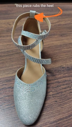 Обувь выглядит классно, она довольно удобная. У них две проблемы: 1. Средний ремешок слишком длинный и торчащий от ноги, 2. Серебряный ремешок на пятке грубая и натирает, мне придется что-то там пришивать и переделать