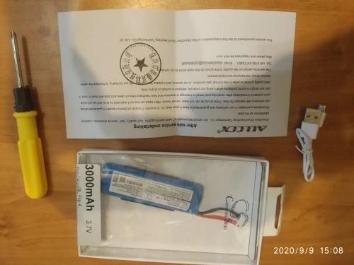 Заказа пришёл чуть больше чем через месяц, были некоторые проблемы с доставкой, которые продавец помог быстро решить. Аккумулятор уже установлен в колонку всё работает замечательно! В подарок шёл кабель и отвёртка.