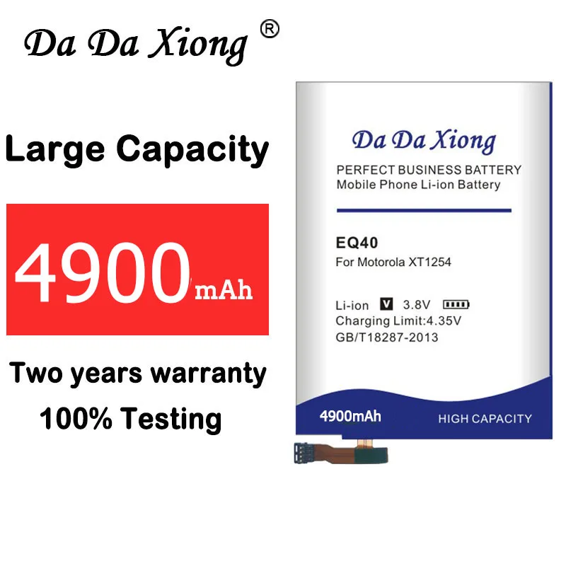 100% Оригинальный Da Xiong новый и высококачественный аккумулятор. Емкость:4900 мА · ч Напряжение: 3,8 V Тип: li-ion Используется дляMotorola Moto Droid Turbo XT1225 XT1254 Безопасность и окружающая среда: двойные функции защиты. Двойная электрическая плата IC и PCB защищают от разрядки заряда и короткого замыкания. Наша батарея того же размера с оригинальной батареей. Два года гарантииПосылка включает в себя: