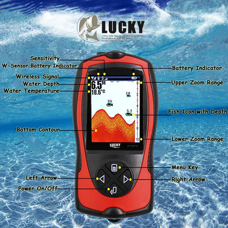 Эхолот Lucky разработан специально для любительского и профессионального рыбака. Он может определить глубину воды и легко узнать рыбу. Просто наслаждайтесь рыбалкой!