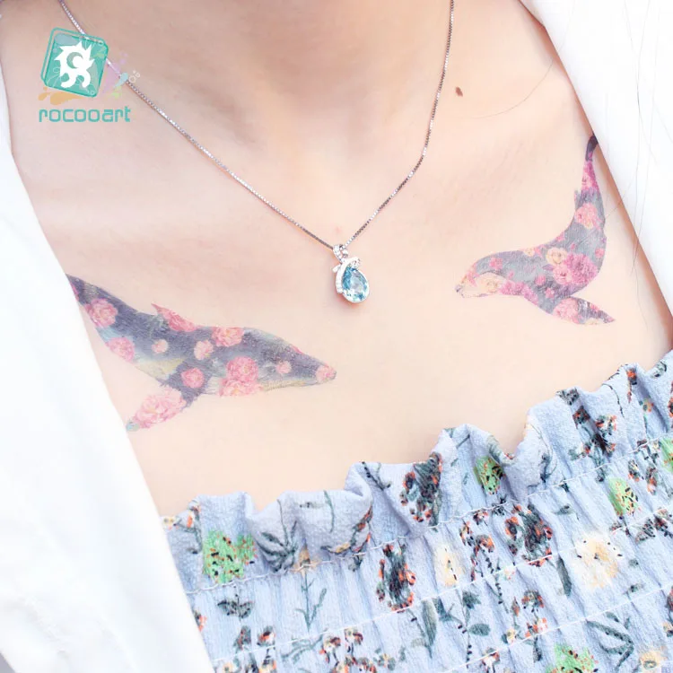 Татуировка Rocooart с цветными китами, имитация, боди-арт, флэш-тату, цветок, птица, временная татуировка, наклейка для женщин, татуировка, красный журавль, тату