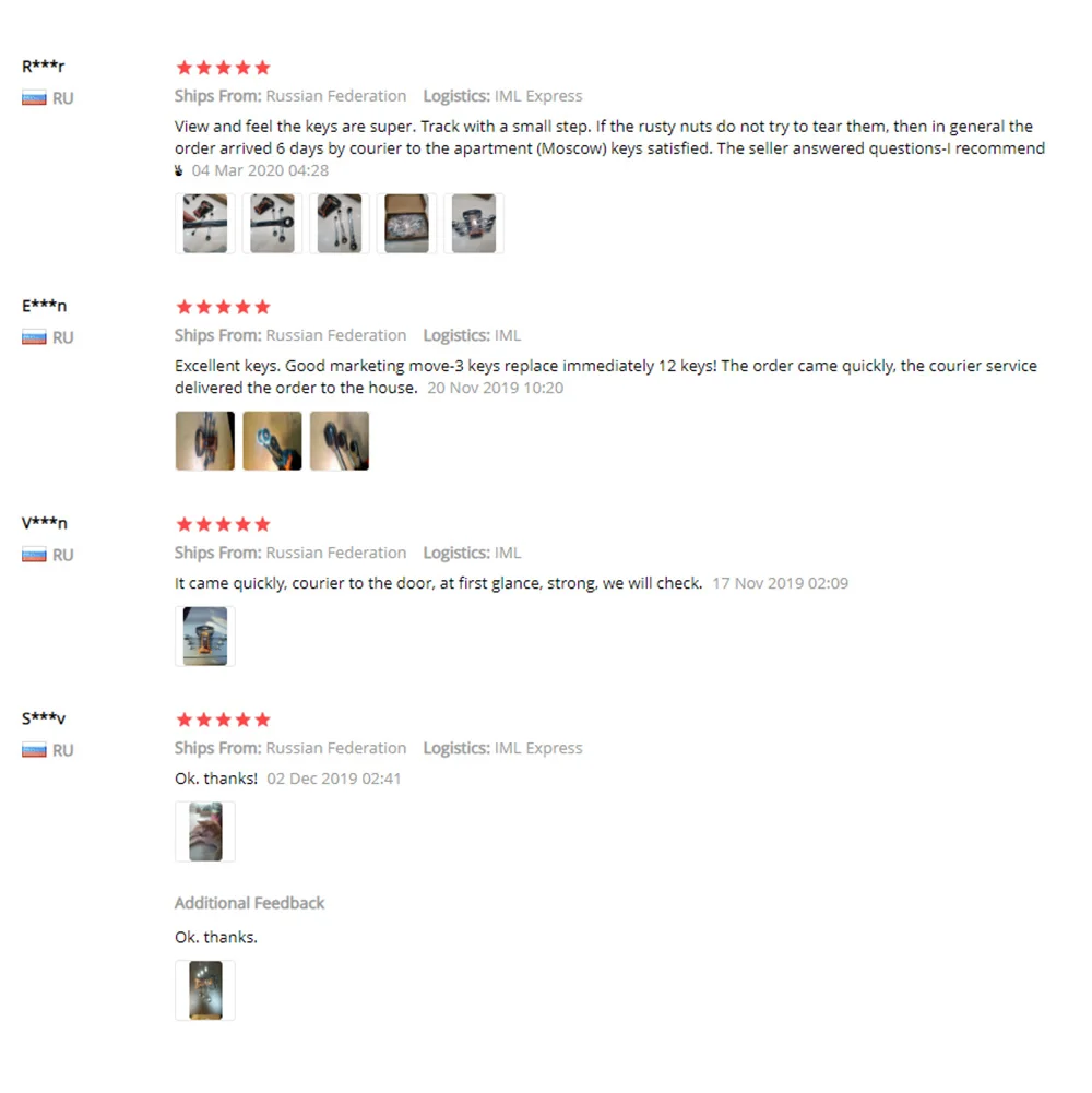 Товар пришел молниеносно-три дня! Очень удобно! Единственное не удобно,то что каким-то образом попал на курьера,вроде его не заказывал,если бы не был в отгуле,то не знаю как забирал товар! В общем все супер! Ключи такого плана проверены,а на данный момент решил взять набором,в хозяйстве все пригодится! Рекомендую!!!