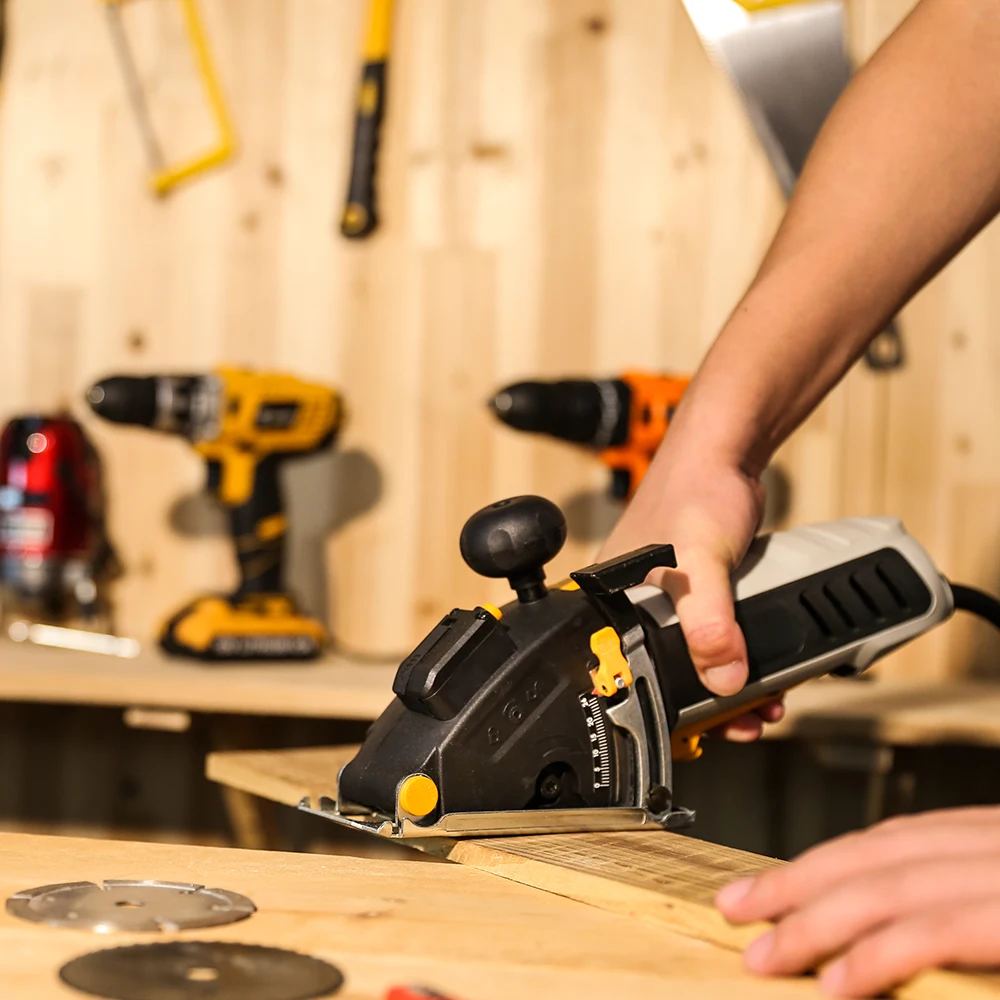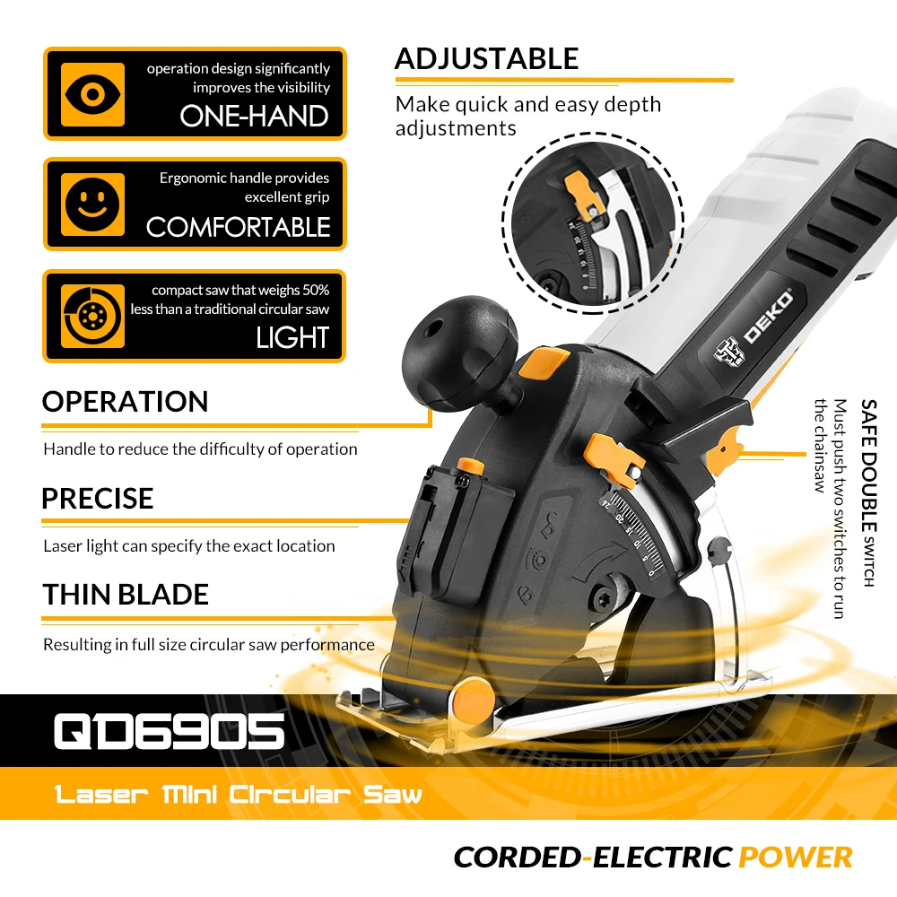 Циркулярная Пила DEKO Mini (DKMS85Q1)-мощная и функциональная циркулярная пила. Нет необходимости в громоздкой циркулярной Пиле, когда компактная циркулярная пила будет с легкостью резать древесину/древесные материалы/пластик/плитку/печатные платы/Стекловолокно армированный пластик комфорт, благодаря своей легкой и компактной конструкции. С мини-циркулярной пилой DEKO легко, комфортно и управляемо справляйтесь с любой из этих задач, всего одной рукой. А эргономичная рукоятка управления-захвата делает ее самым быстрым, простым и удобным инструментом в наборе инструментов.