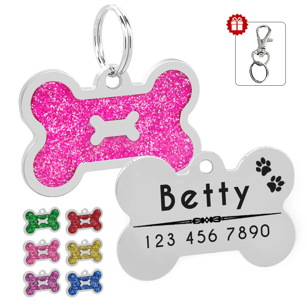 Блестящая Персонализированная идентификационная бирка для собак, индивидуальная табличка с именем в форме кости, аксессуары для домашних животных, украшение для ошейника для собак розового и красного цвета