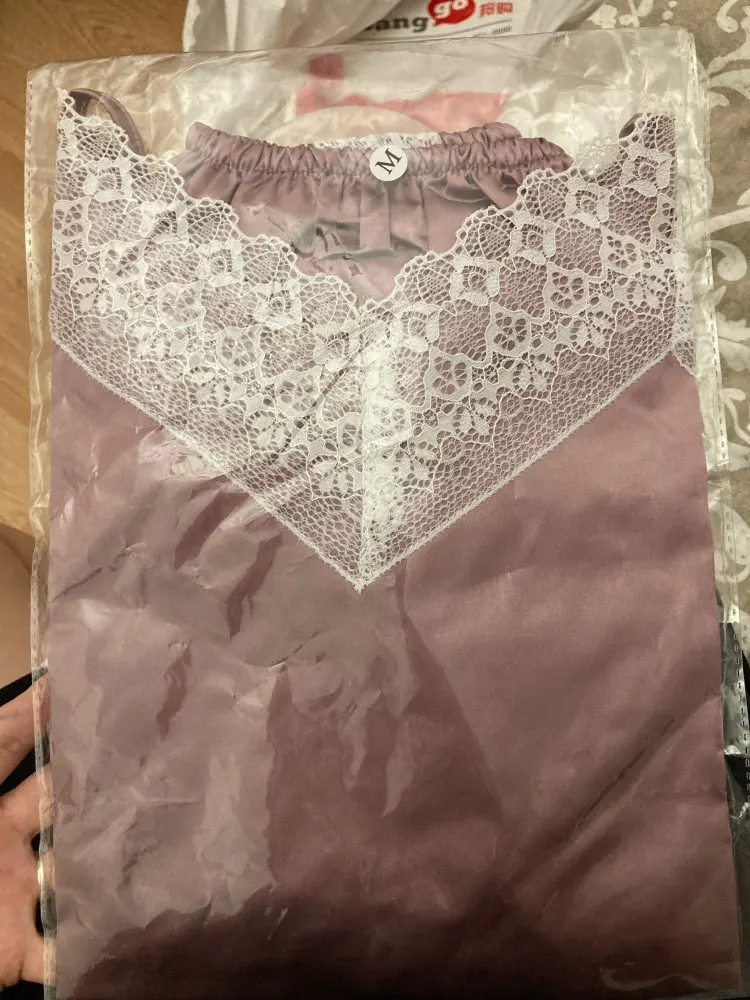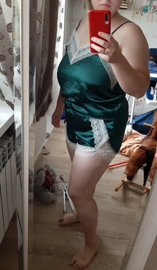 Доставка до Новосибирска 3 недели, трек отслеживался. Забирала на почте, заказывала много чего другого, просто вложили все посылки в один пакет, за что огромное спасибо. На Ог 92 от 78 об 99 рост 172 см вес 62 кг размер L хорошо свободно, в XL бы точно утонула, брала по отзывам. Думаю можно взять и меньше размер но резинка на шортах будет давить.Очень мягкая ткань, лёгкая не весомая, но единственный минус это то что от любой капли остаются разводы, если вы по дому не чего не делаете тогда отличный вариант, но я его носила как домашнюю одежду, придётся просто чаще стирать. Ставлю 5 звезд за то что вернули деньги, так как пришёл комплект бракованный, оторванная лямка, криво прошит шов на шортах на самом видном месте. Именно этот комплект больше брать не буду, фасон вызвал смущение, шорты похожи на парашют, сама майка ну уж очень широкая, не моё, но носить буду. Кружева хорошие, мягкие, швы все ровные.