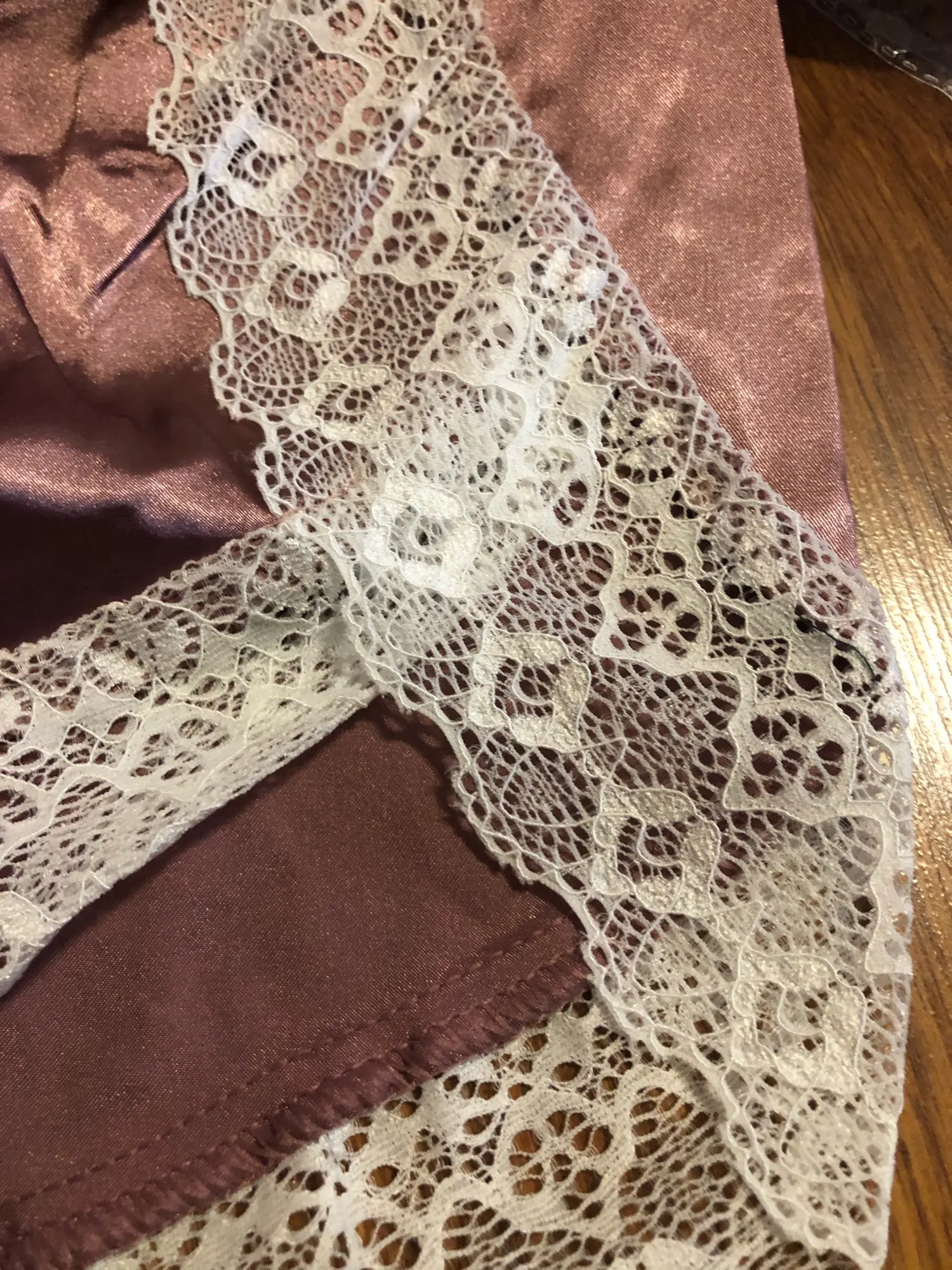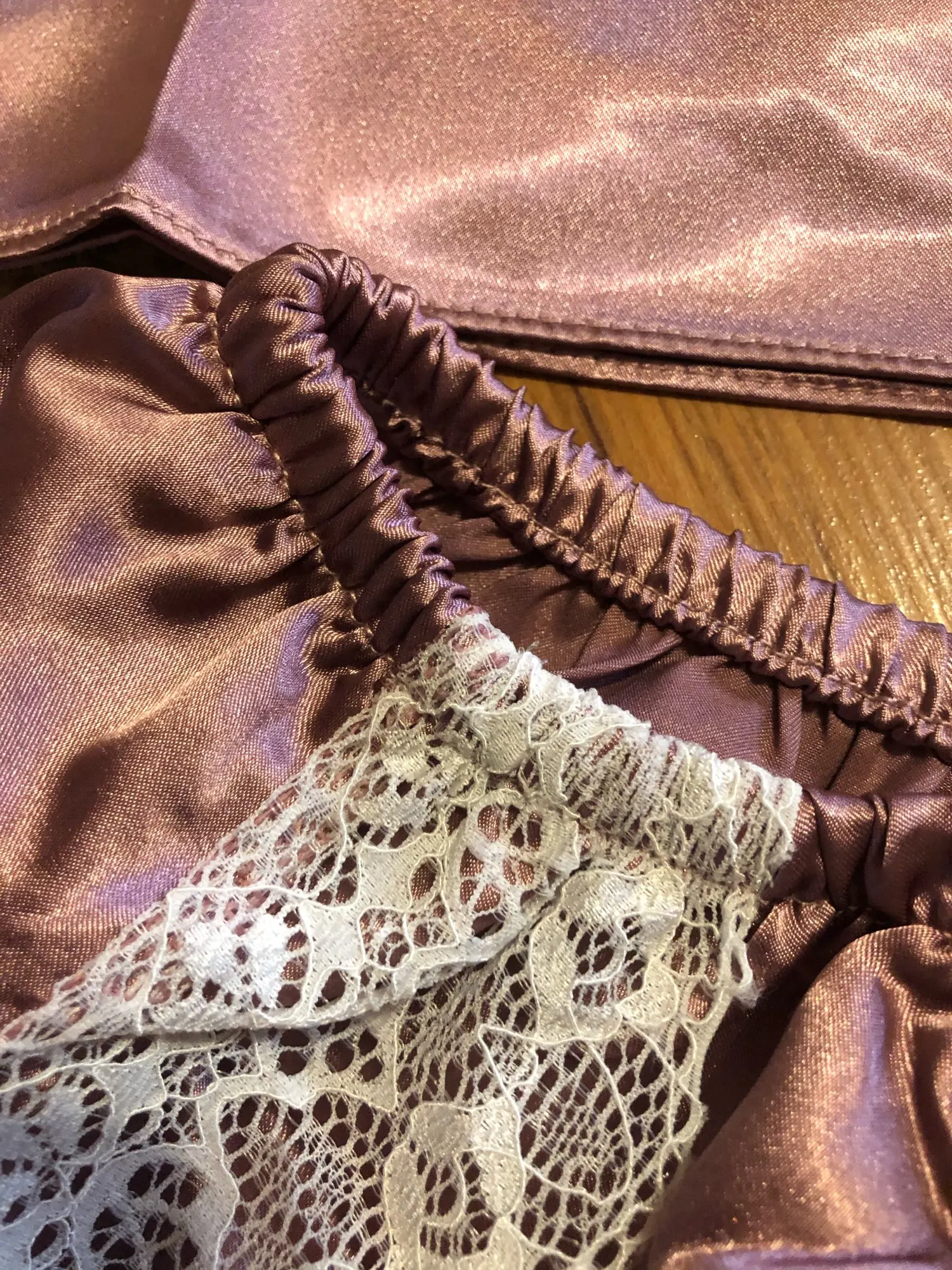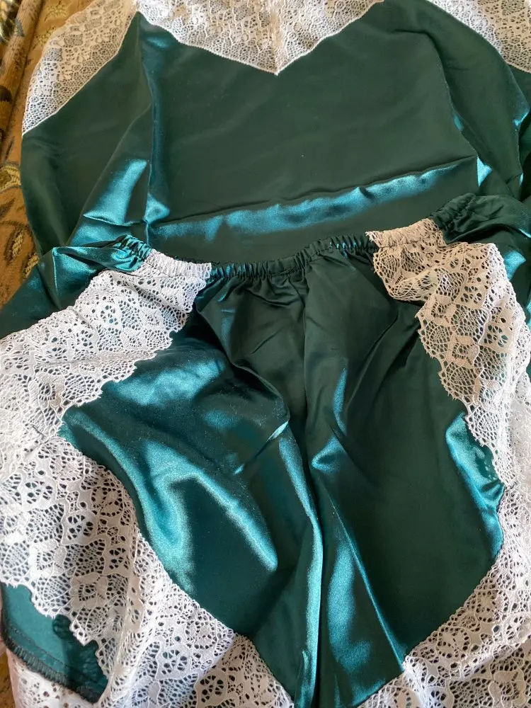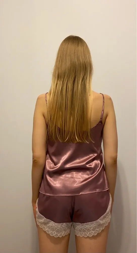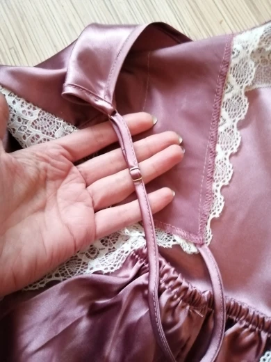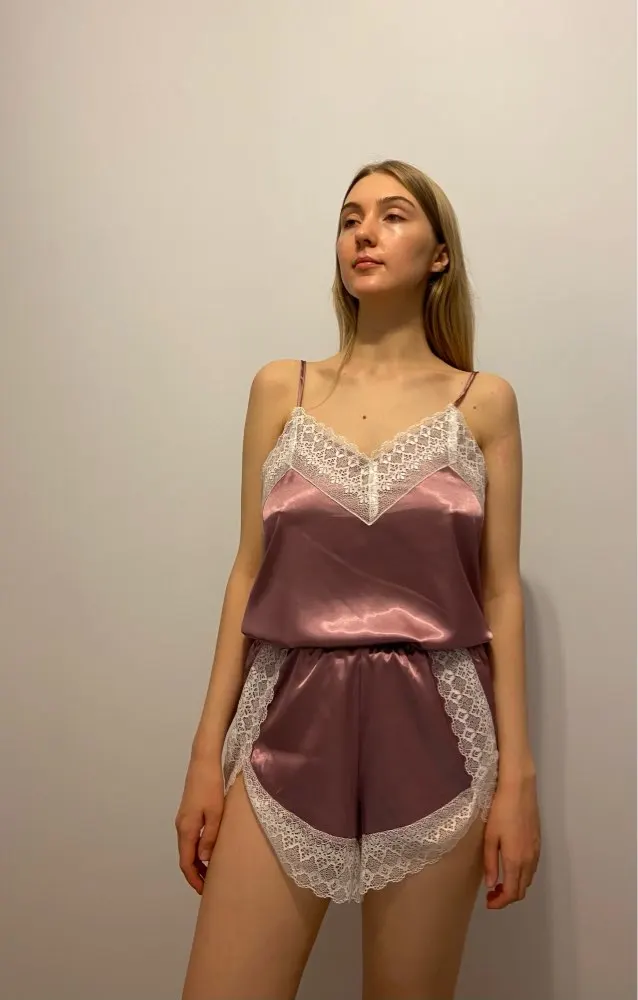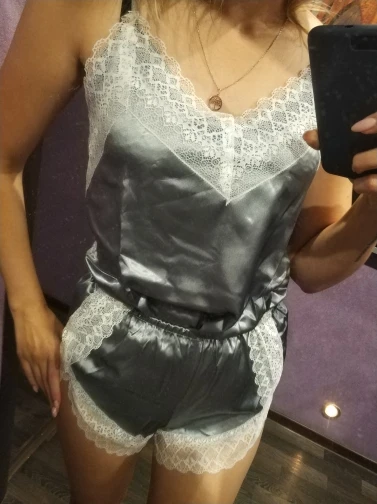 Цвет приятный. Ткань атлас, кружево мягкое. Шортики сели, как надо, не в обтяг. Т.к из-за шорт брала на размер больше, топ в груди большеват, но не критично. Долго сомневалась при покупке , но качество превзошло все ожидания.