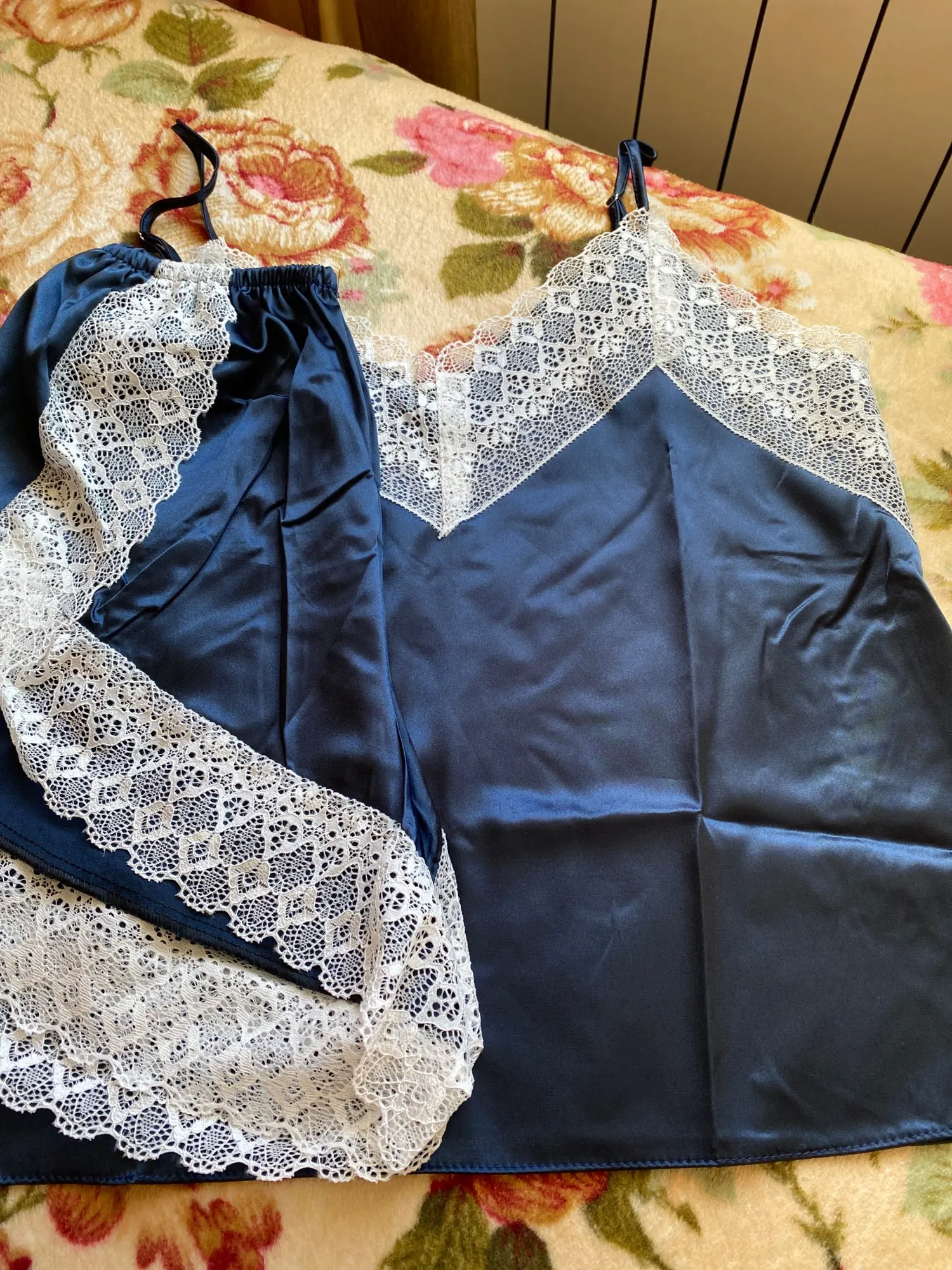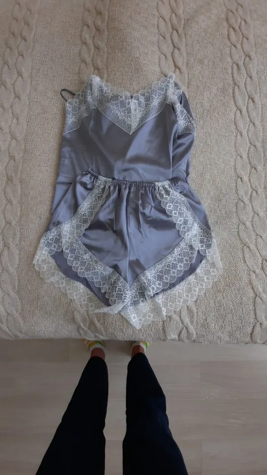 пижама прелесть - качество огонь, цвет благородный (на фото она голубая, в реальности такой благородный серо-голубой, умереть какой красоты), кружева аккуратные, xxl сел на 48 размер (ог98, от89, об107) и рост 170 волшебно. за 600 р - это магия! доехала до мск за пару недель. чистый восторг!