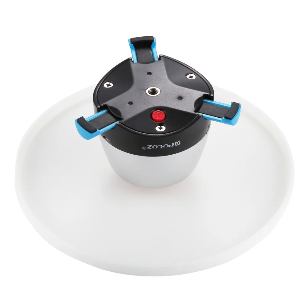 Панорамная головка штатива1. Универсальный винт 1/4 дюйма, совместим с компактными камерами Canon/ Nikon/ Sony/Pentax и другими облегченными зеркалами с резьбой 1/4 дюйма; Включает крепление, подходящее для GoPro 5/4/3 +, экшн-камеры и iPhone, Galaxy, Huawei, Haweel и другие смартфоны, крепление для телефона может выбрать лучший угол для съемки (Угол наклона + 90 градусов, более подробную информацию, пожалуйста, проверьте руководство пользователя).2. Панорамная головка управляется поставляемым инфракрасным контроллером вместо смартфона. База имеет только переключатель включения/выключения питания. Пульт дистанционного управления может быть сопряжен с вашим смартфоном через Bluetooth, учитывая, что система смартфона выше Android 3,0 или iOS 4,0. Сделайте Панорамное изображение, нажмите кнопку захвата фотографий на пульте дистанционного управления, чтобы запустить смартфон. (Примечание: функция захвата пульта дистанционного управления используется только для управления телефоном, чтобы делать снимки, недоступна для съемки видео, режим видео только для угла поворота)3. Диапазон панорамирования: 90 и 360 градусов. Отлично подходит для панорамной съемки.Круглый лоток1. Изготовлен из высококачественного АБС-материала, прочный в использовании.2. Подходит для панорамного штатива с поворотом на 360 градусов, это хороший инструмент для фотографирования в коробке.3. Белый цвет, экономит время на фотографии4. Полностью отображает все, что вы хотите, чтобы сделать снимок, без рук во время вождения, это очень удобно.