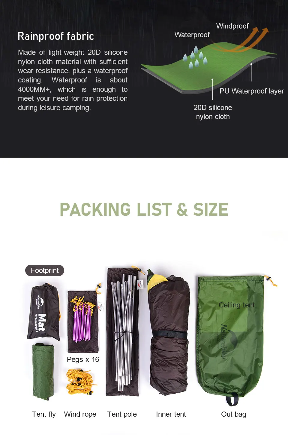 Палатка Naturehike Cloud Peak для 2 человек, непродуваемая нейлоновая двухслойная палатка, для походов и путешествий, 15D