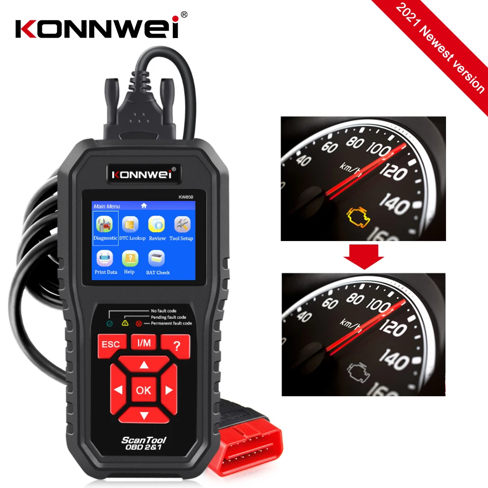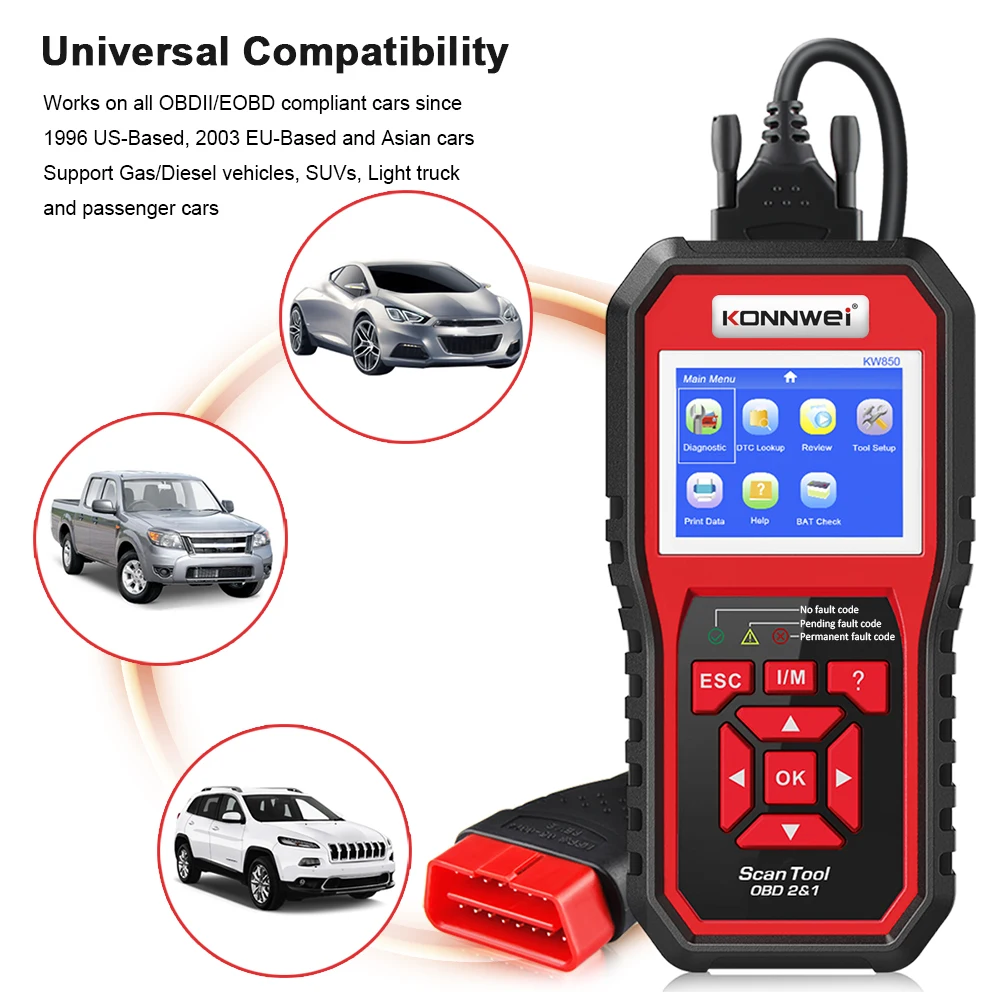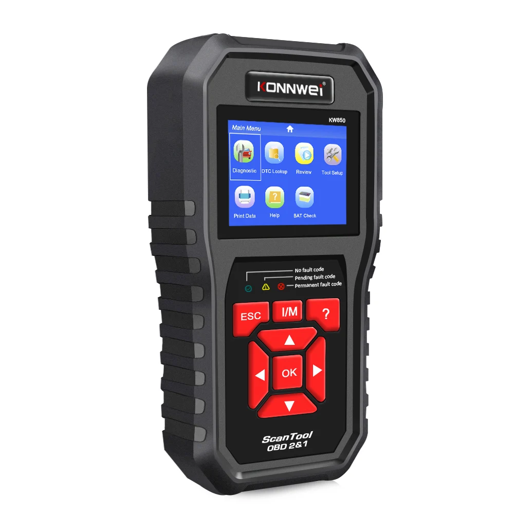 KONNWEI KW850 OBD2 сканер Авто для двигателя scanℜкоды ошибок перемещения, с уникальным нажатием кнопки I/M готовности, TFT цветной дисплей, мониторинг напряжения батареи в режиме реального времени, встроенный DTC вид вверх. Поддерживает более 50 моделей автомобилей; Поддерживает несколько языков; Поддерживает печать данных; Поддерживает бесплатное обновление на протяжении всего срока службы.