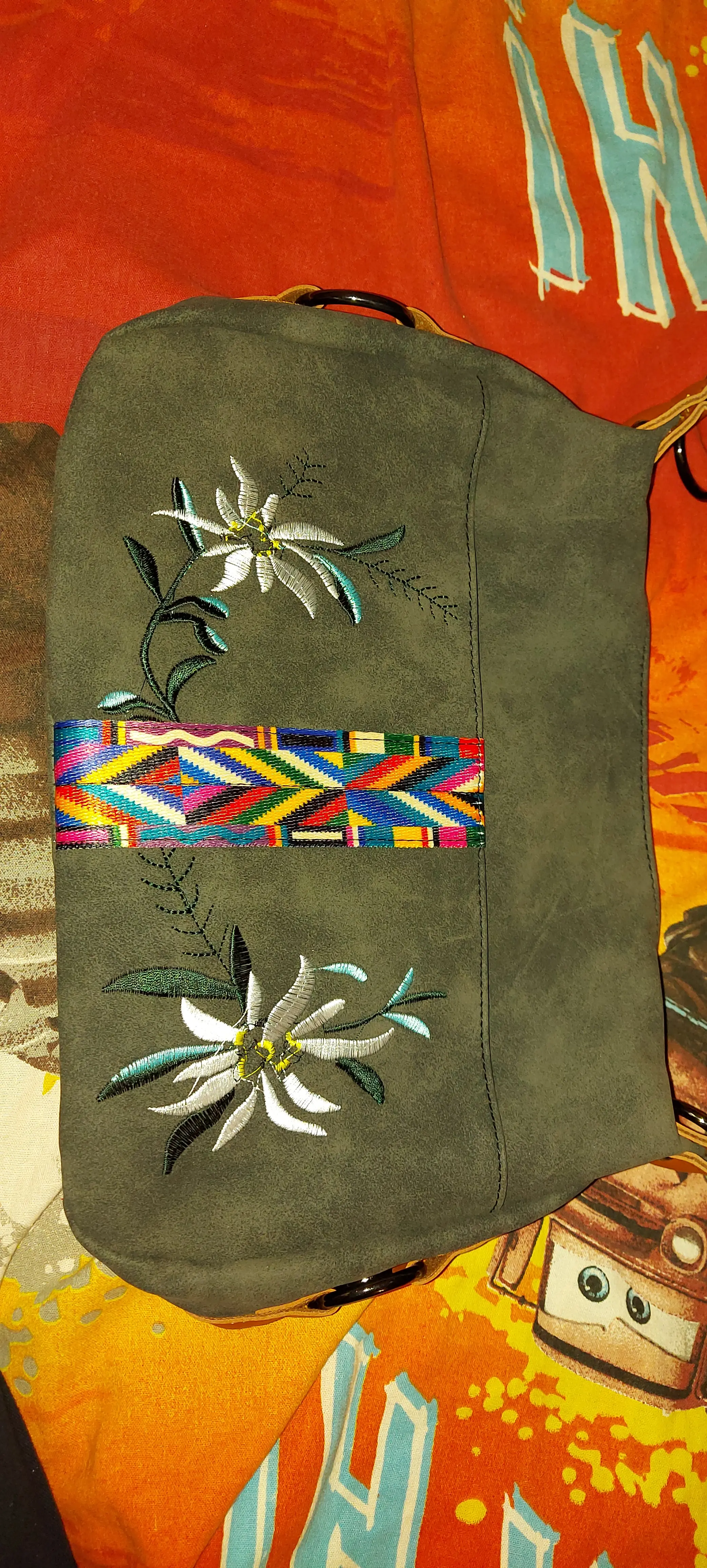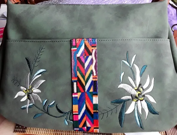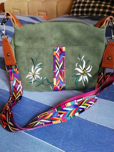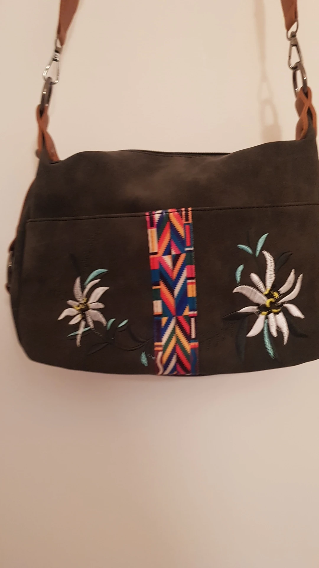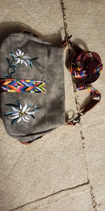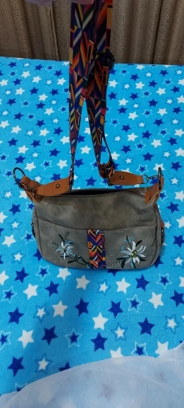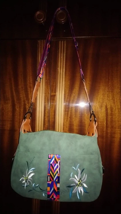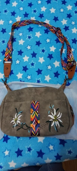 Прошло много времени, чтобы приехать, но выглядит так же, как в описании. Я только с ремешком, вышитым как цветы на боковой стороне сумочки.
