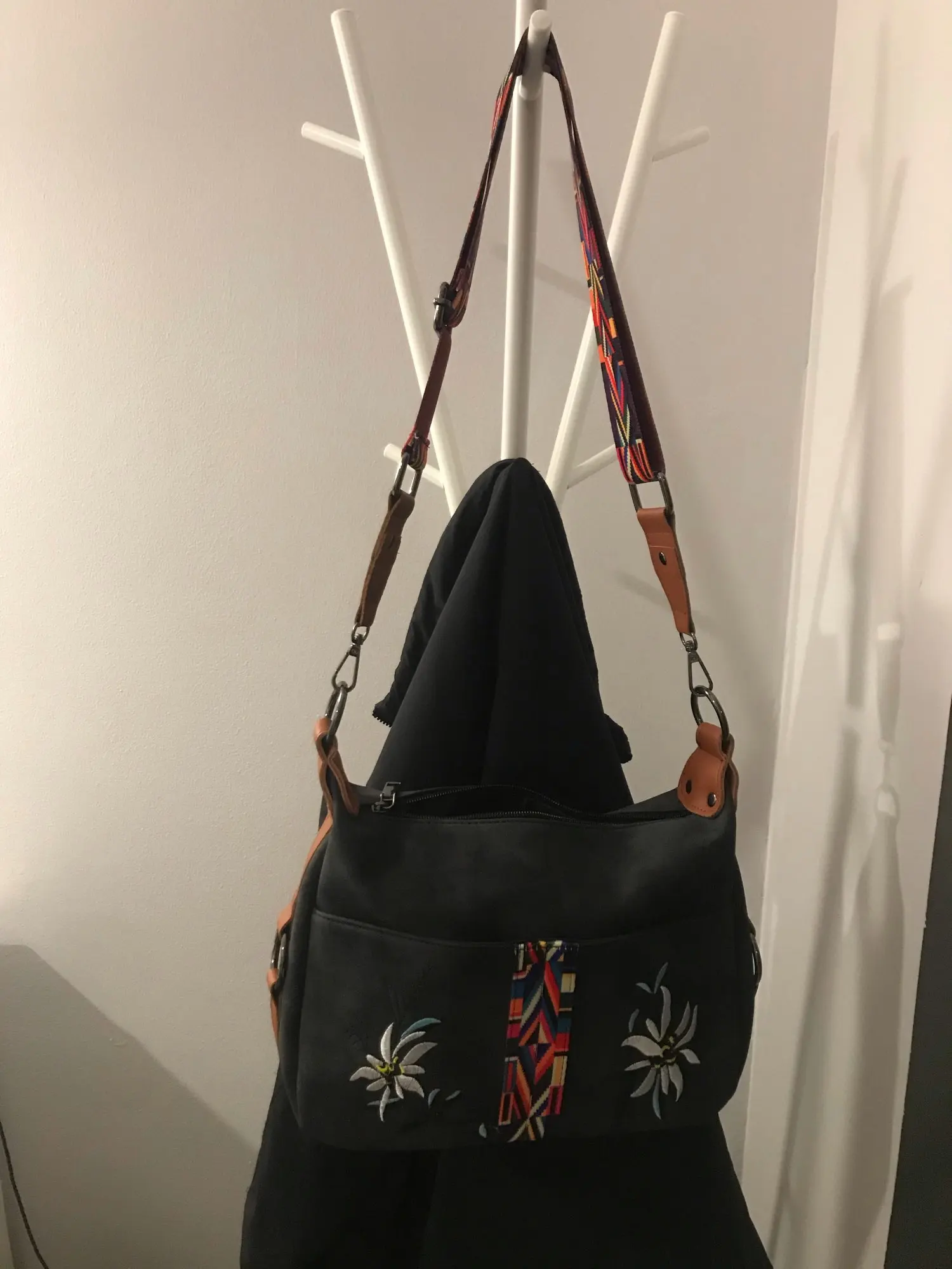 Это красиво! Он имеет много карманов, он достаточно большой и висячая лента длинная, поэтому ее можно скрепить. Я так рад