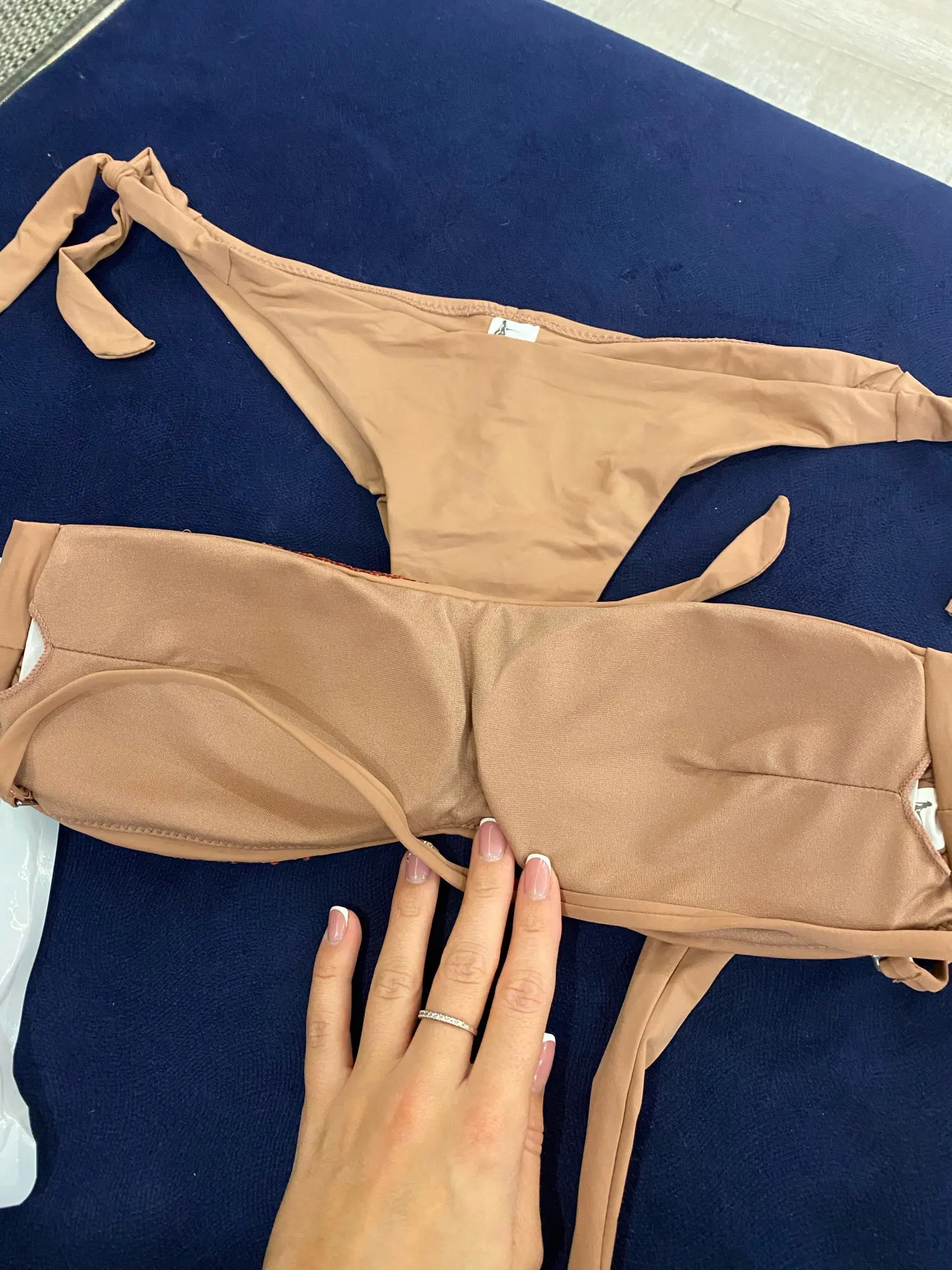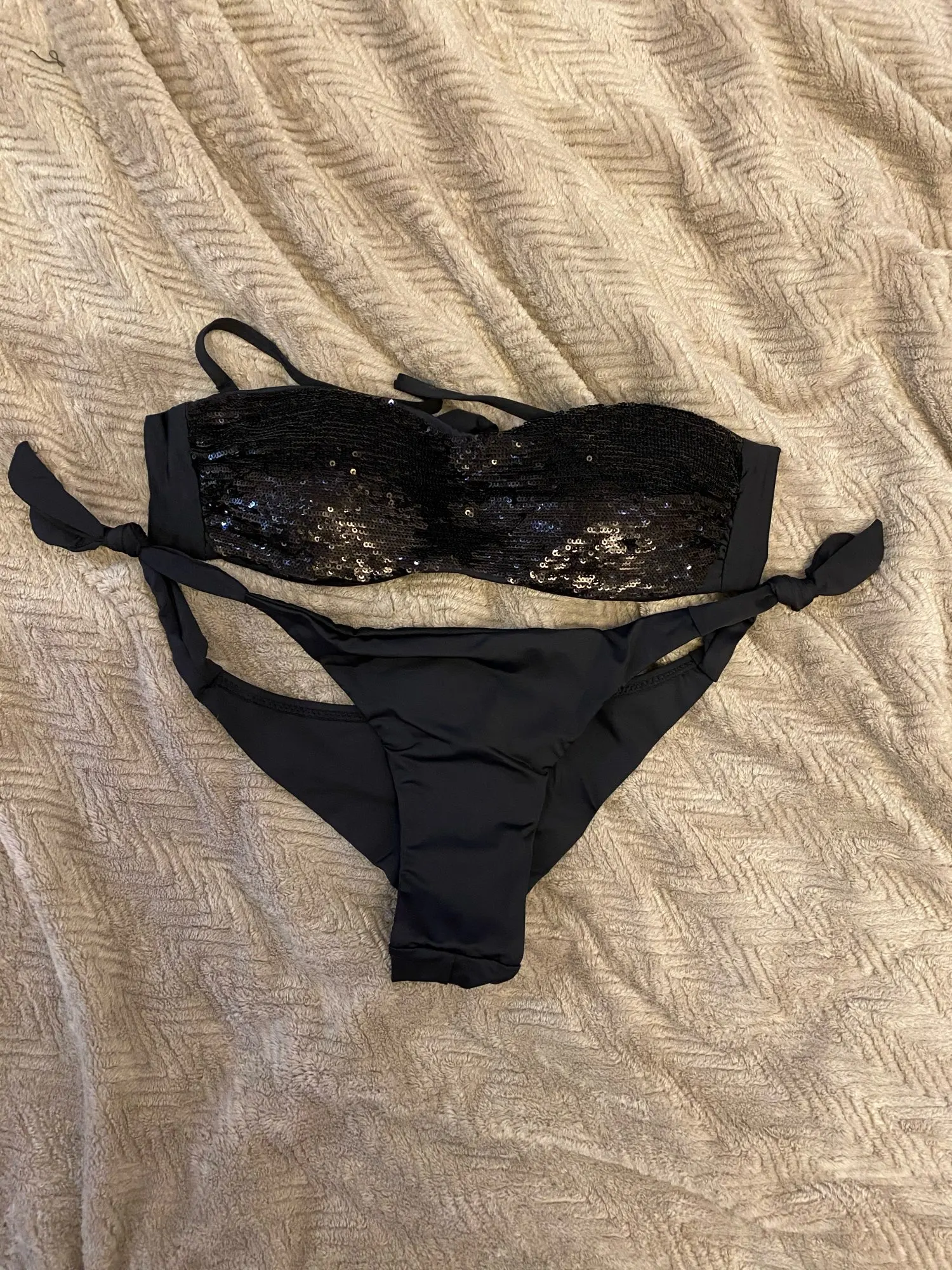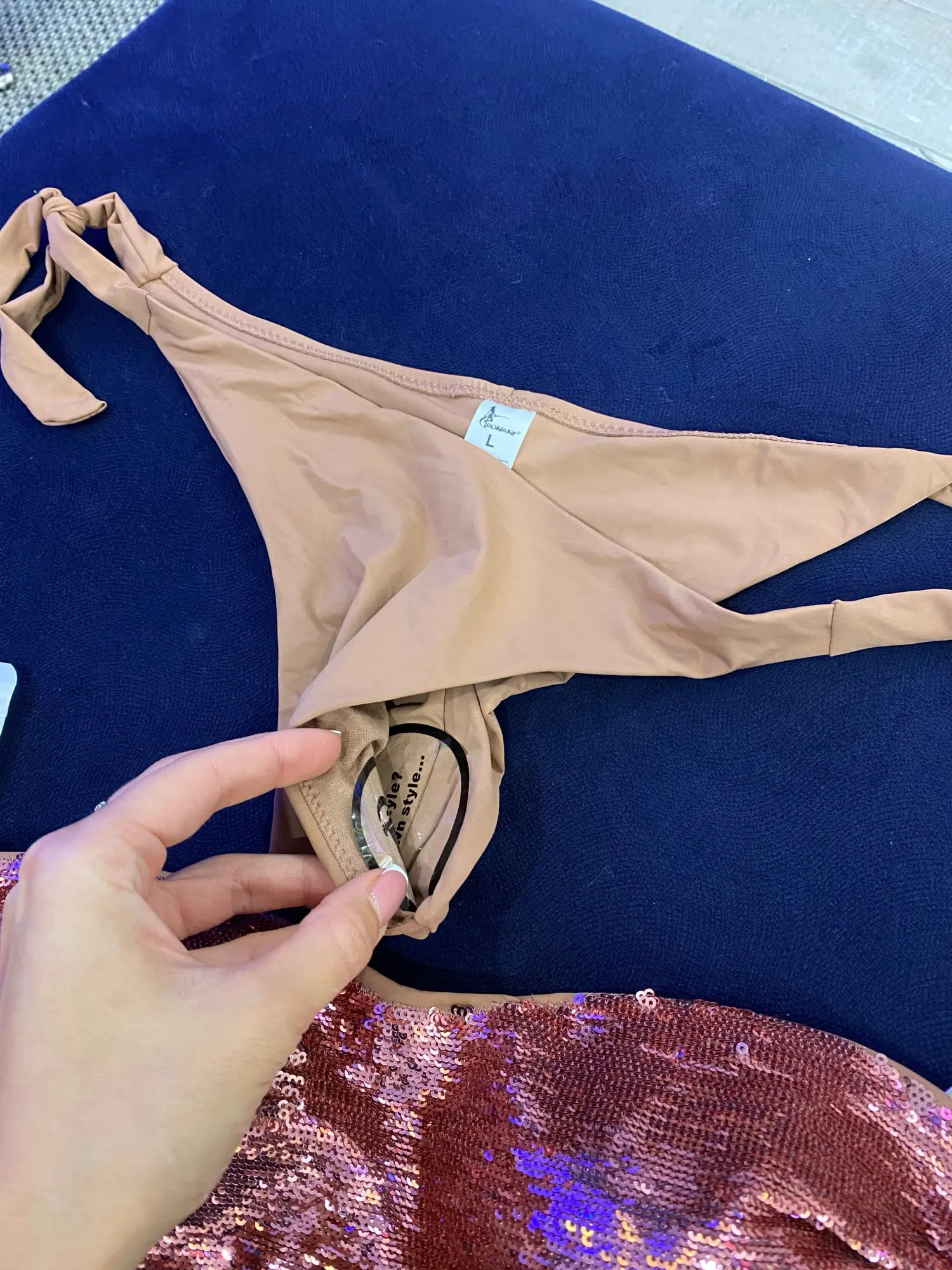 Фантастическое бикини! Размер M идеально подходит для европейского размера 36 и размера s 90/70/90. Расшитые Пайетками цвета хаки розового цвета, но все же подходит.