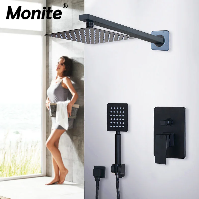 Monite ультра-тонкий светодиодный смеситель для душа черный матовый 8 10 12 дюймов Настенный Ванная комната дождевая матовая черная головка ручной душевой набор