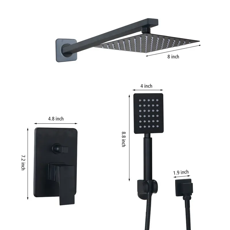1 × ультратонкийДушевая головка (ABS пластик) с душевой ручкой (латунь)1 × Многофункциональный сплошной латунный регулирующий клапан(Твердая латунь)Латунный ручной душ с пластиковым крючком и выходомВ комплекте со всеми установочными аксессуарами