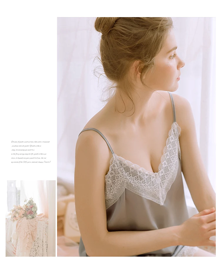 Новинка, женские шелковые спагетти, топ на бретелях + шорты, комплект для сна, v-образный вырез, Женская Высококачественная сорочка, кружевная Лоскутная женская ночная рубашка