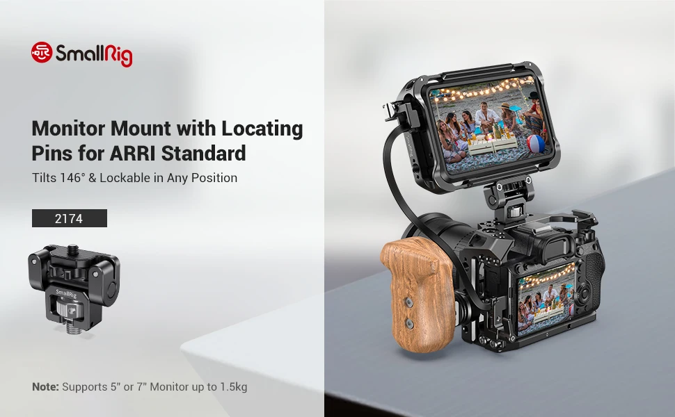 SmallRig наклон монитор крепление с ARRI 3/8 ”-16 винтовой 2174 Предназначен для удержания монитора на клетке камеры, ручке или других монтажных системах с помощью винта ARRI 3/8 ”-16 для предотвращения скручивания. Алюминиевый держатель позволяет наклонять на 146 ° без использования инструментов и без остановок в любом положении. Он может поддерживать 5 "или 7" монитор до 1,5 кг. С резиновой прокладкой сверху, чтобы предотвратить царапины вашего монитора. Каждый винт оснащен слотами для шестигранного гаечного ключа, чтобы закрыть его и обеспечить безопасность вашего монитора. Кроме того, вы можете отрегулировать герметичность крепления монитора, регулируя винт M4 с каждой стороны на основе ваших потребностей.