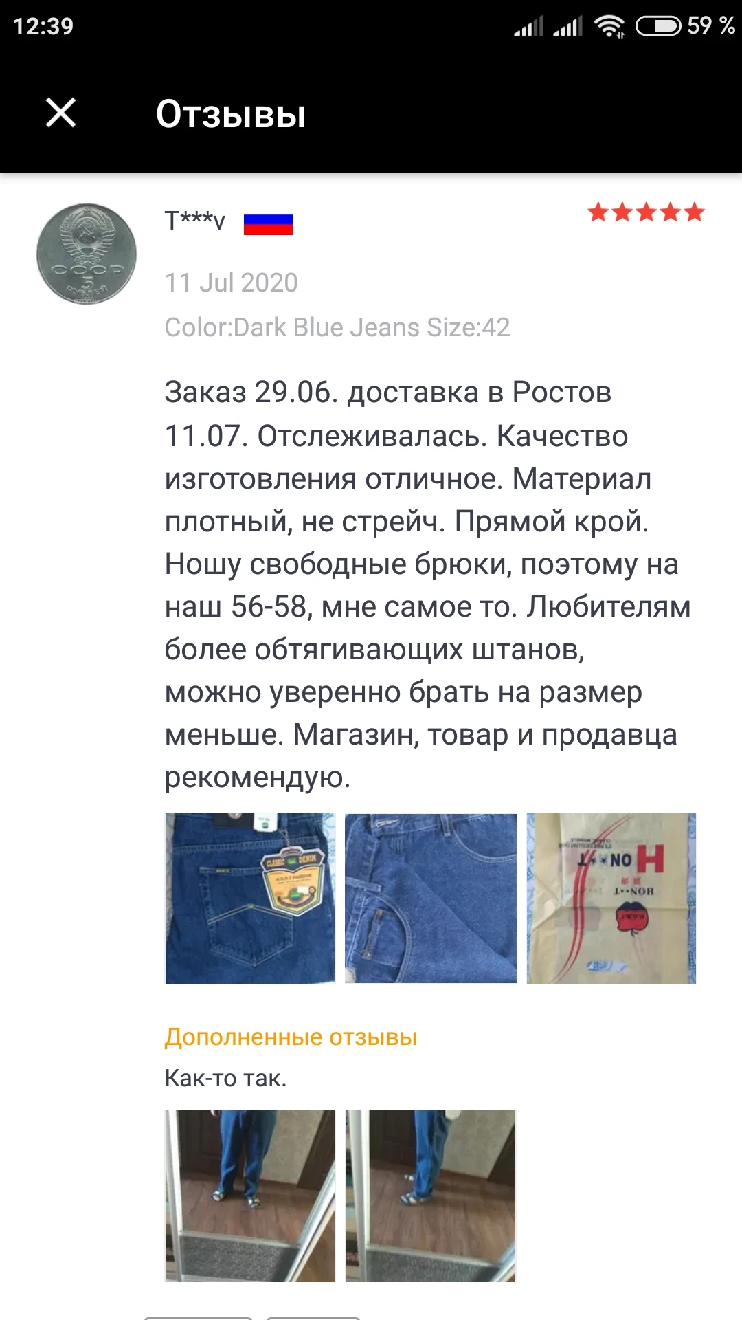 Продавца очень рекомендую. Джинсы дошли в Москву за 10 дней. Брала для сына по размерной сетке. Рост 182, подошли, сидят, как влитые; по длине, как на него шили , Я и сын очень довольны. Продавцу огромное спасибо, здоровья и процветания ♡