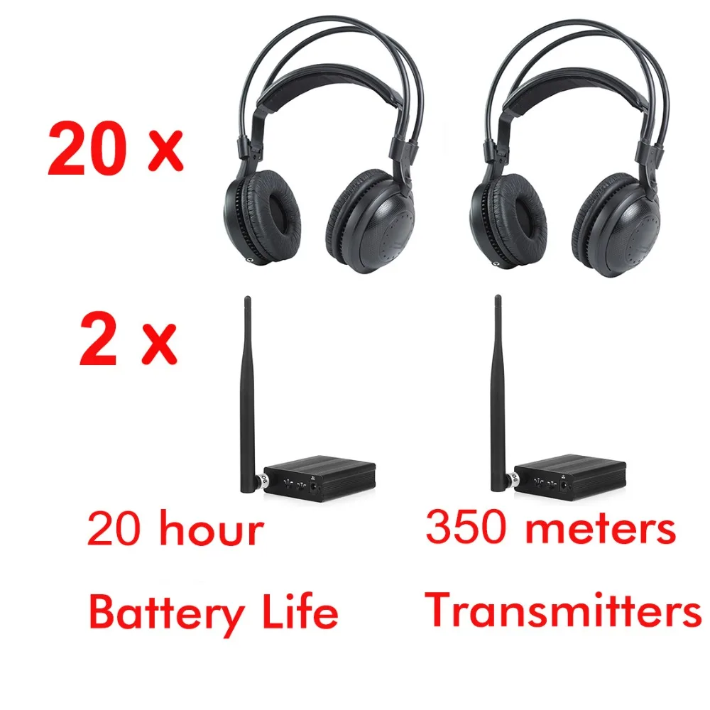 20 x UHF-6 Беспроводной диско наушники2 x 350mtr передатчики4 xAudio кабели (2 xRCA/2x3,5 мм)2 x сетевой адаптер (Великобритания/евро/США/Oz)Все, что вам нужно, это наше здесь!