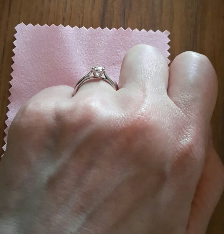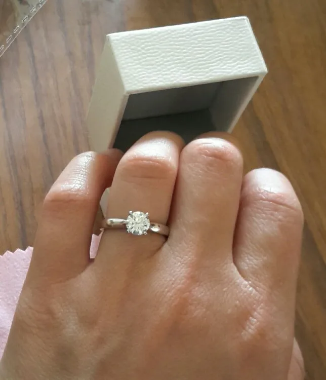 Колечко понравилось! Не тонкое, не хлипкое, гладкое, округлое, на руке сидит комфортно. Корона кольца не высокая, что тоже очень удобно. Муассанит хороший. Покупала в этом магазине подвеску, так муассанит несколько желтит в ней. В кольце почище цвет. Упаковка в подарочной коробочке, как всегда, отправка и доставка в этот раз были быстрые. Внутри колечка есть обозначение серебра и обозначение камня. Есть сертификат на камень, как всегда, который в принципе просто бумага :) , не имеющая никакого отношения к официальному сайту GRA. Раз проверила и поняла, что это липовый сертификат. Тем не менее, камни в этом магазине действительно муассаниты.