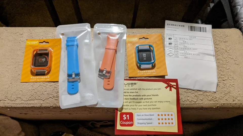 Дошли быстро. ремешок мягкий, приятный на ощупь. Бампер надевается поверх часов очень туго (в маем случае пока надевал малость погнул). Перед зарядкой бампер лучше снимать, иначе его снимет зарядка - сломав при этом.