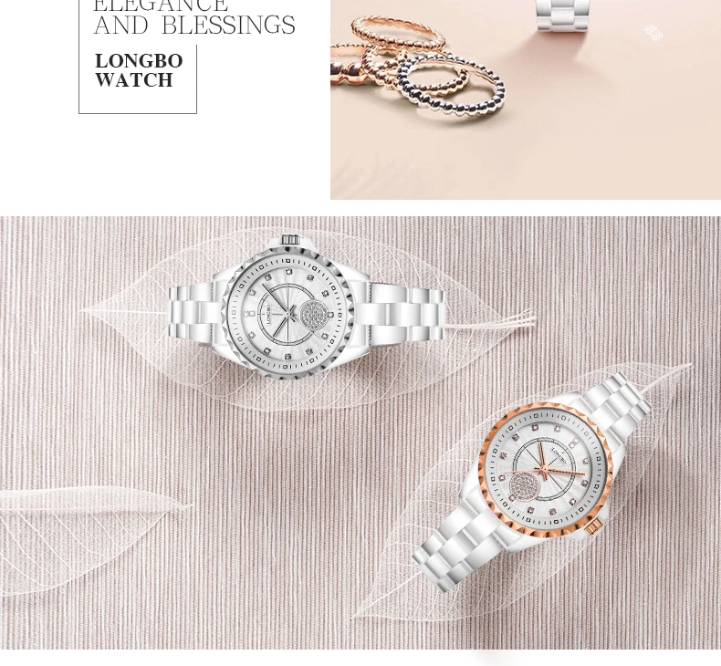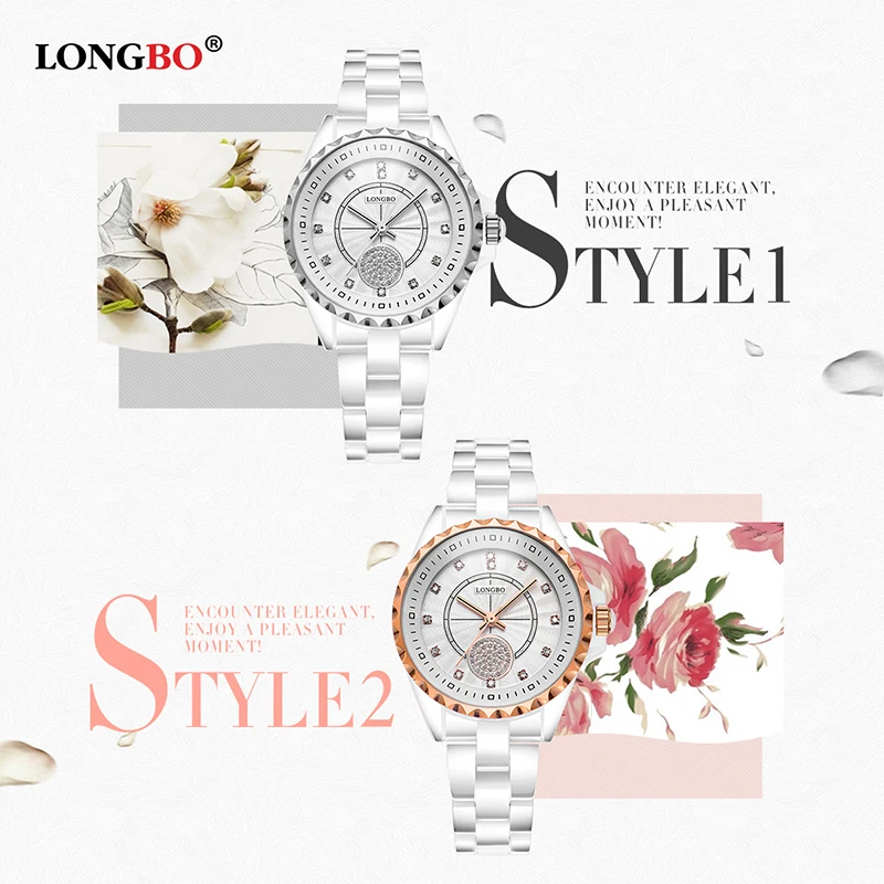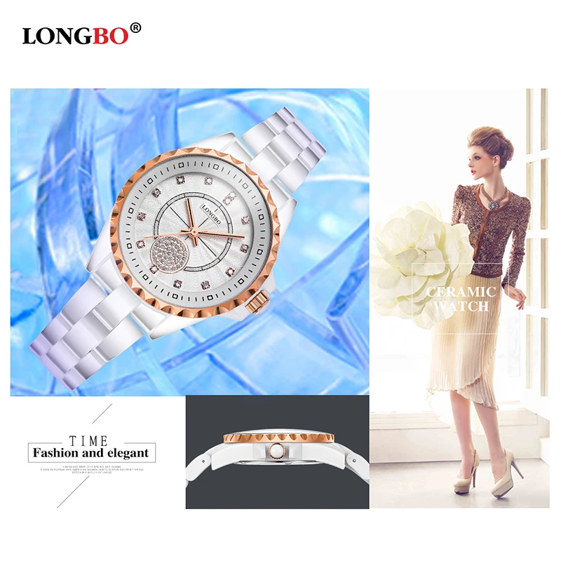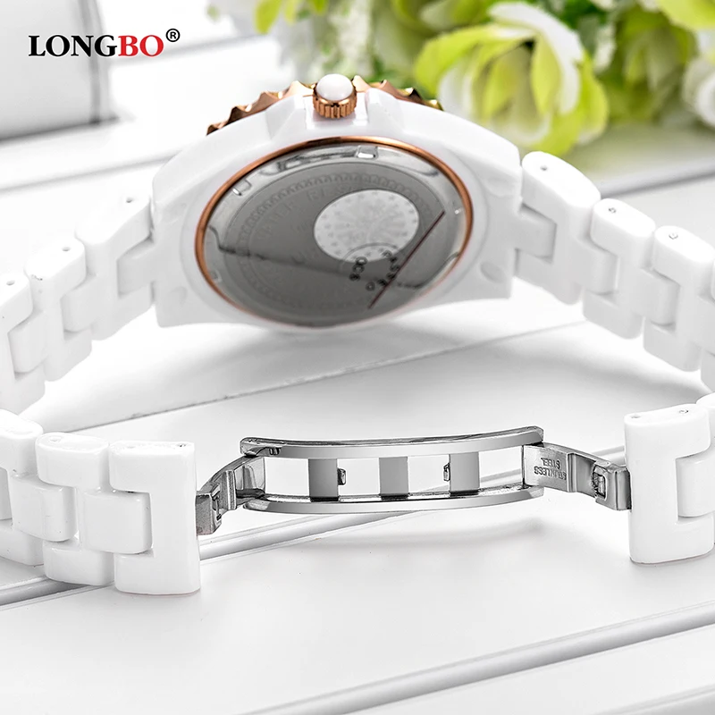 Часы наручные Longbo женские кварцевые с керамическим ремешком, модные повседневные модные, с камнями, белые