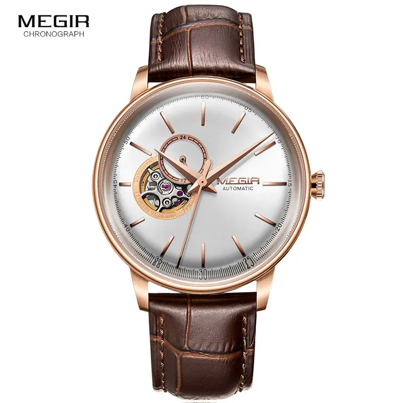 Мужские модные повседневные механические часы MEGIR с кожаным ремешком, простые деловые аналоговые наручные часы для мужчин, розовое золото 62057, GREBN