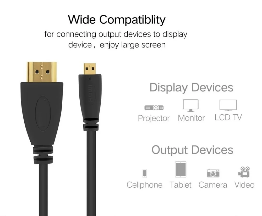 Кабель Micro HDMI-HDMI обеспечивает видео высокой четкости и цифровое аудио с цифровых устройств на ваш домашний кинотеатр. Он предлагает идеальный способ подключения цифровых устройств с портами Micro HDMI (HDMI D) к HDTV или проекторам с полноразмерными портами HDMI (HDMI A).