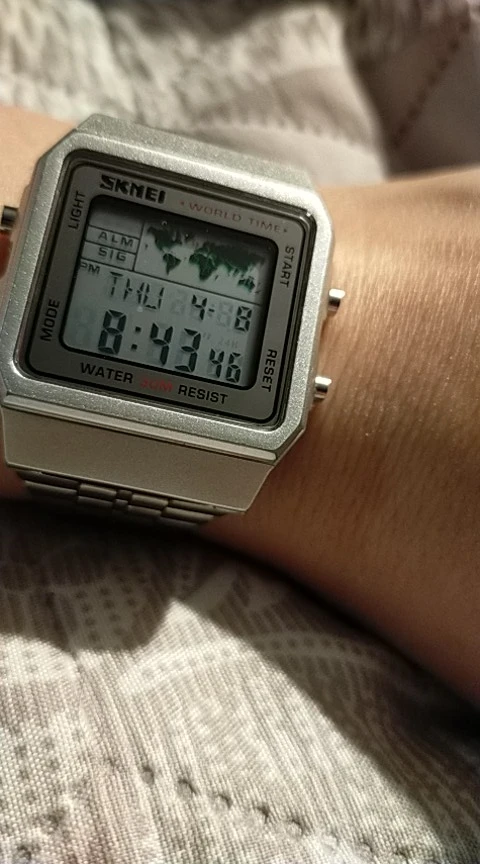 Часы в целом хорошие. Пластиковый корпус выглядит дешево и имеет небольшую разницу в цвете, поэтому я рекомендую вам получить черный, только если вам действительно нравятся эти часы. Все значки зеленой карты мира загораются, но они выбираются случайным образом, поэтому они не показывают текущий часовой пояс. Если говорить о часовых поясах, то их много. Вам нужно только установить час для одного часового пояса, и он будет регулировать остаток, как и ожидалось от нескольких часовых поясов часов. Материал ремешка грубая и может использоваться для полировки, но это не повредит вашу кожу, и выглядит так, что это не повредит. Возможно, он был поврежден во время доставки, потому что зажим с регулируемой лентой был полностью забитым. Он был зафиксирован после некоторого грубого воздействия. Я рекомендую вам купить эти часы, только если они действительно вам нравятся, потому что SKMEI имеет много лучших вариантов, таких как их светодиодные часы с силиконовым ремешком.