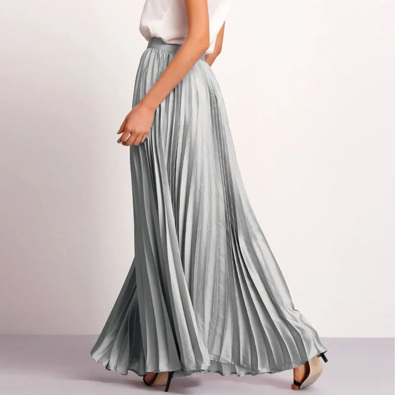 Женская длинная юбка в пол, серебристая плиссированная атласная юбка на молнии, 2018, юбки женские молнии