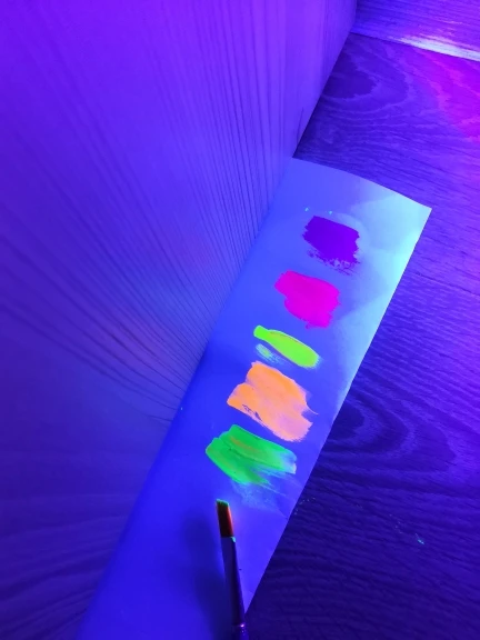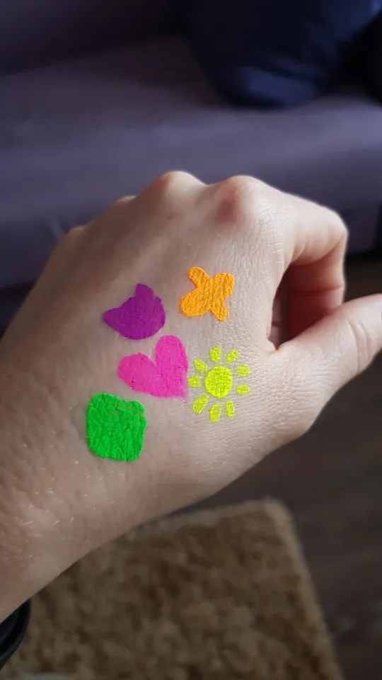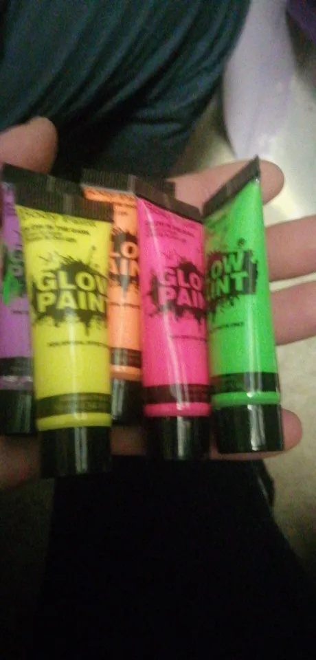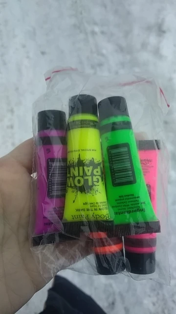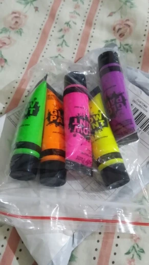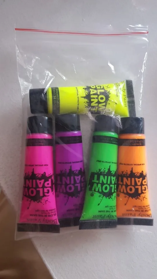 Прикольные краски. ярко светятся в ультрафиолете, кроме фиолетового - он темный. отлично смывается с тела, а вот с тканей - нет. будьте осторожны!