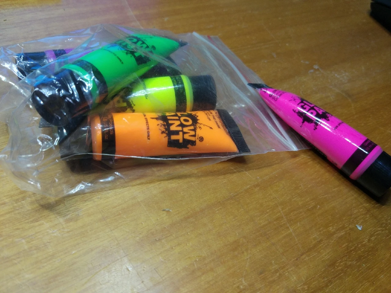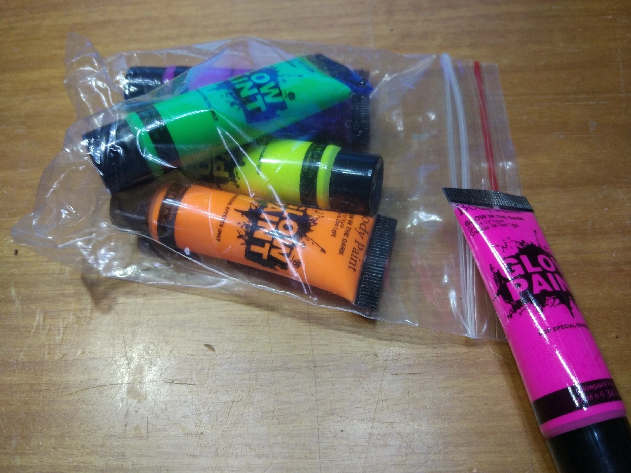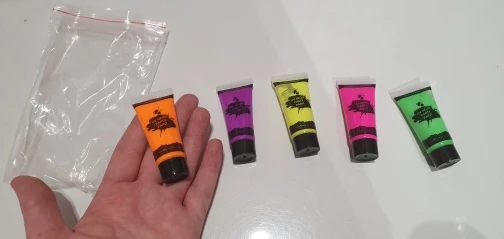 Краски яркие, неоновые цвета, хорошо смываются, но - не светятся. Я их и на свет дневной выкладывал, и просто в темноте открывал - все одно, не светятся. Переживать не стал, и так сойдет.