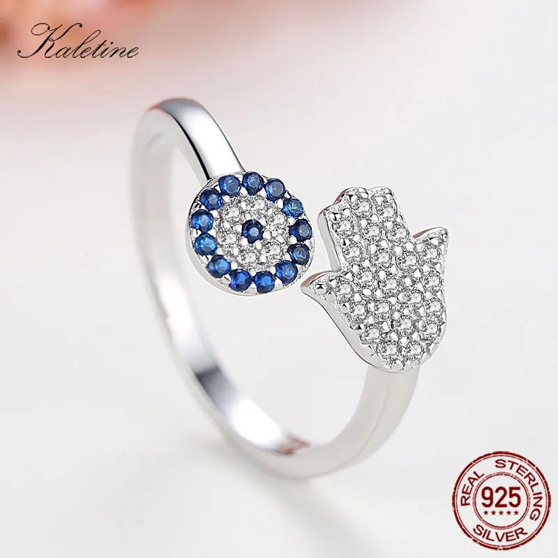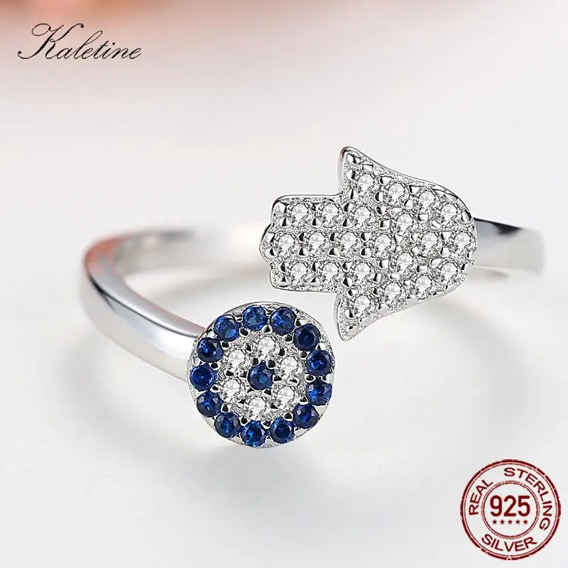 Рука Фатимы кольцо зло, счастливый глаз стерлингового серебра 925 Серебряные Кольца Открытые, кольца на палец CZ с голубыми глазами для Для женщин однотонные Серебряные ювелирные изделия KLTR122