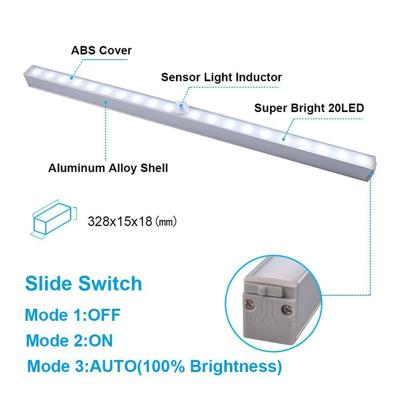 Светодиодный светильник для шкафа, беспроводной 20 LED датчик движения под шкафом, работающий от батареи, шкаф, ночник, светодиодный светильник