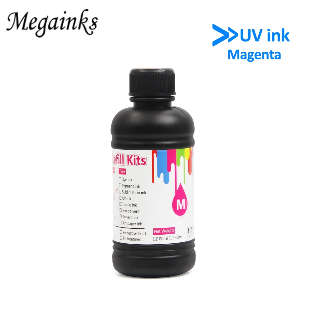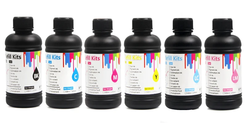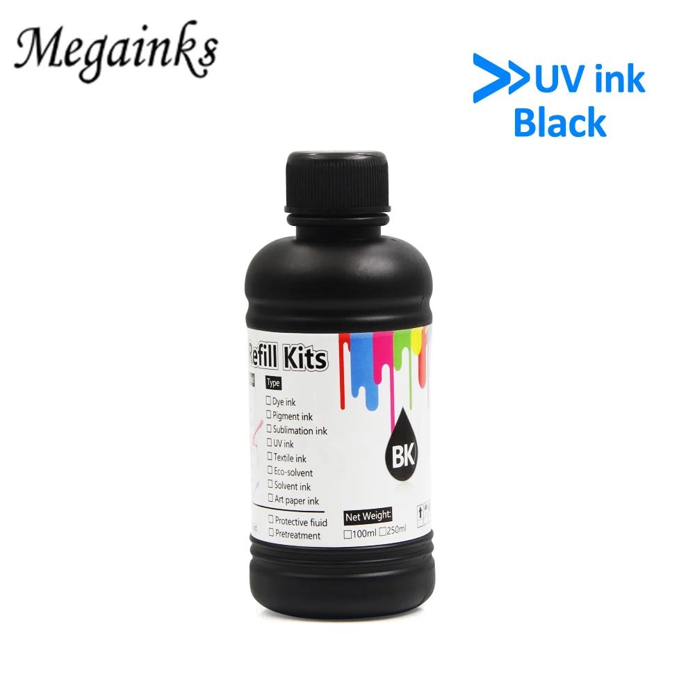 -Мягкие УФ-чернила (чернила из мягких материалов) Используется в мягких материалах, таких как кожа, мягкая пленка, ПВХ, ткань светильник вых коробок, наклейки на корпус, мягкая пленка из ТПУ, обои и т. д. -Твердые УФ-чернила (чернила из твердых материалов) Используется в твердых материалах, таких как стекло, металл, керамика, акриловая доска, Плита KT, дерево, алюминиево-пластиковая плита, АБС и т. Д.