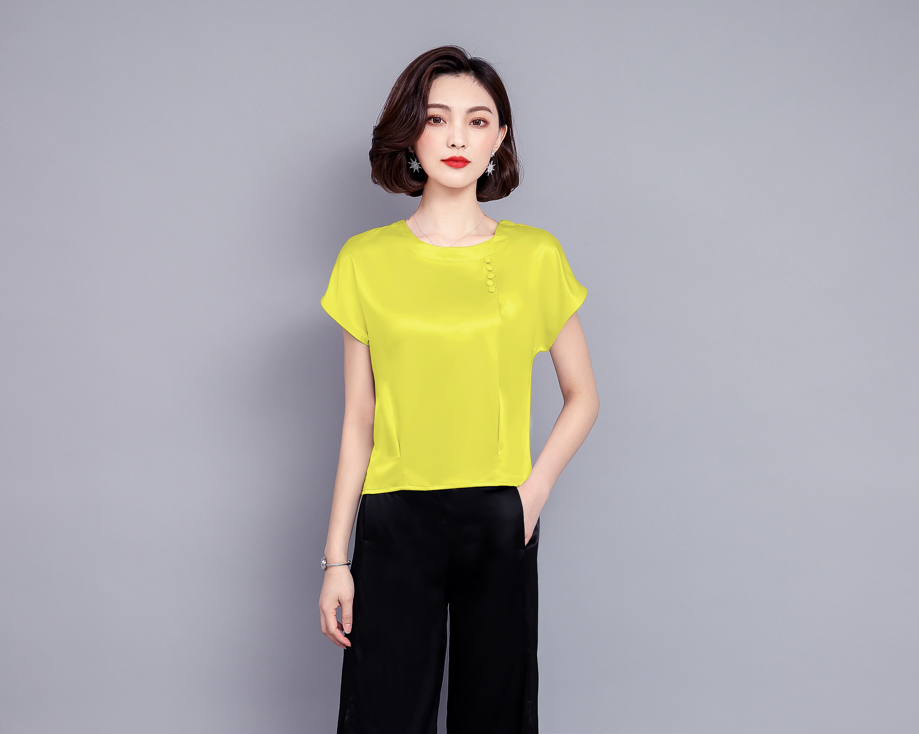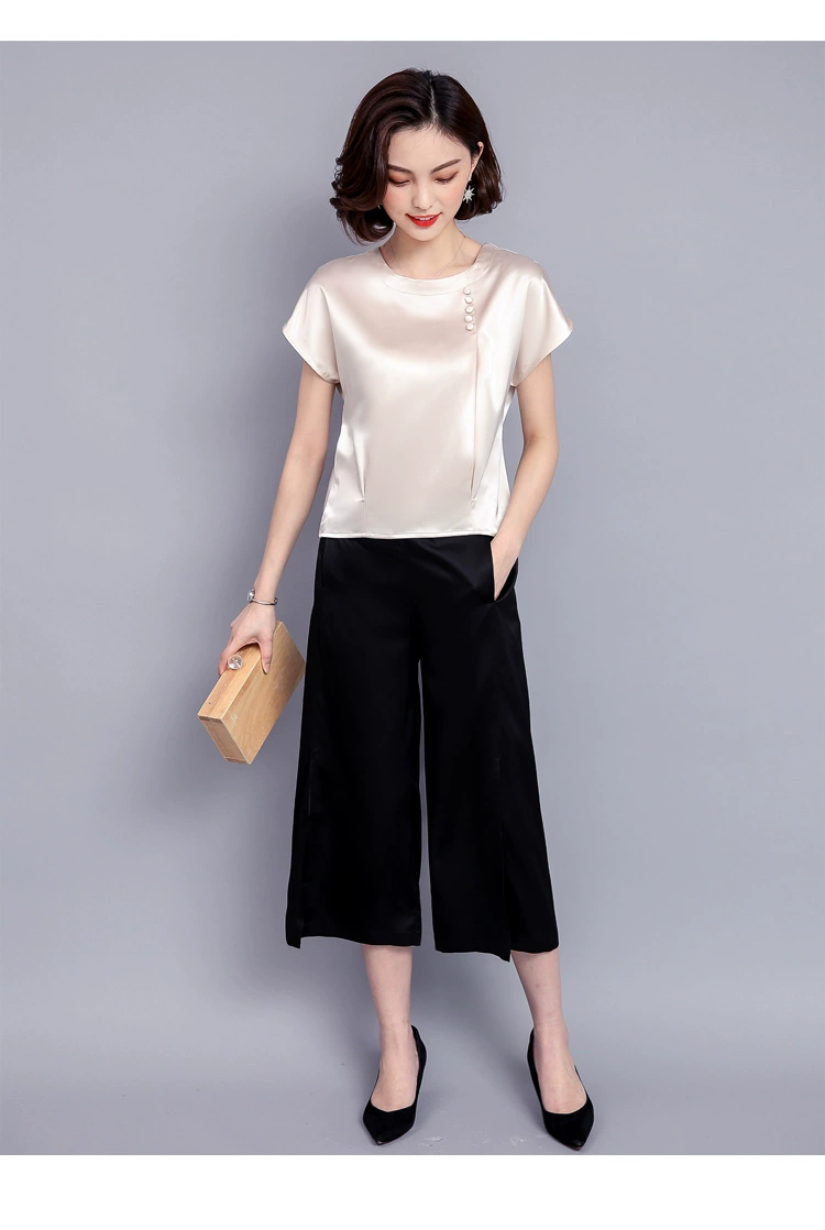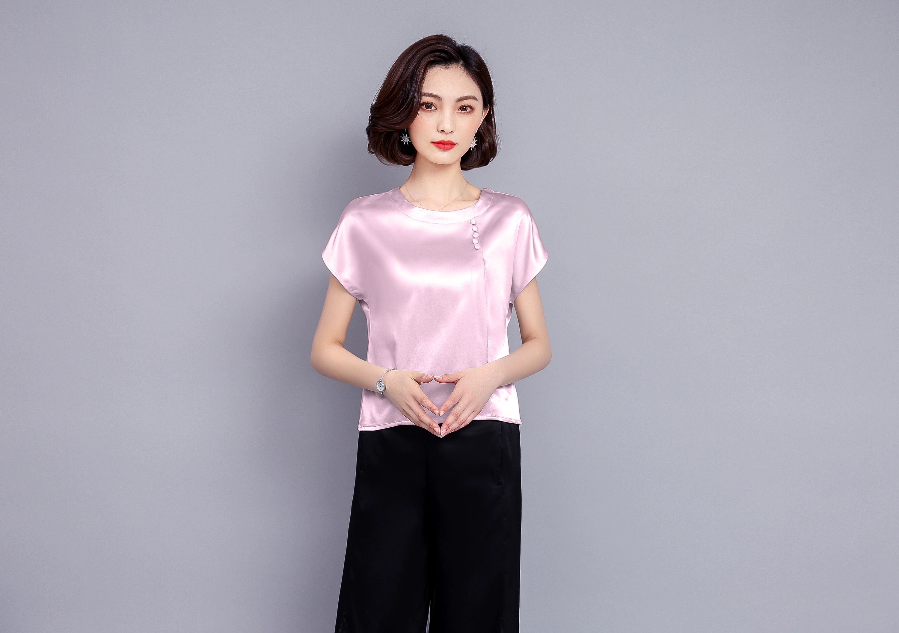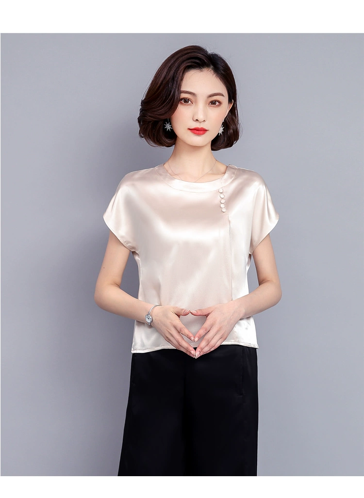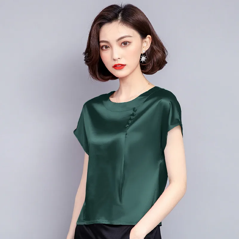 2018 Новая модная летняя одежда женские топы однотонные свободные шелковые блузки с короткими рукавамивырезом рубашки Повседневные женские с круглым блузки 0425 40