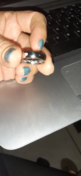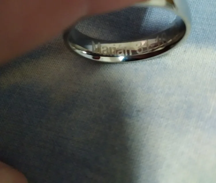 Чудесное Кольцо. Металл блестящий и индивидуальные слова внутри ясны и легко читаются. Это именно то, что я хотел. Время доставки было достойным для того, как далеко он должен был путешествовать. Очень доволен этим продавцом. Рекомендуется.