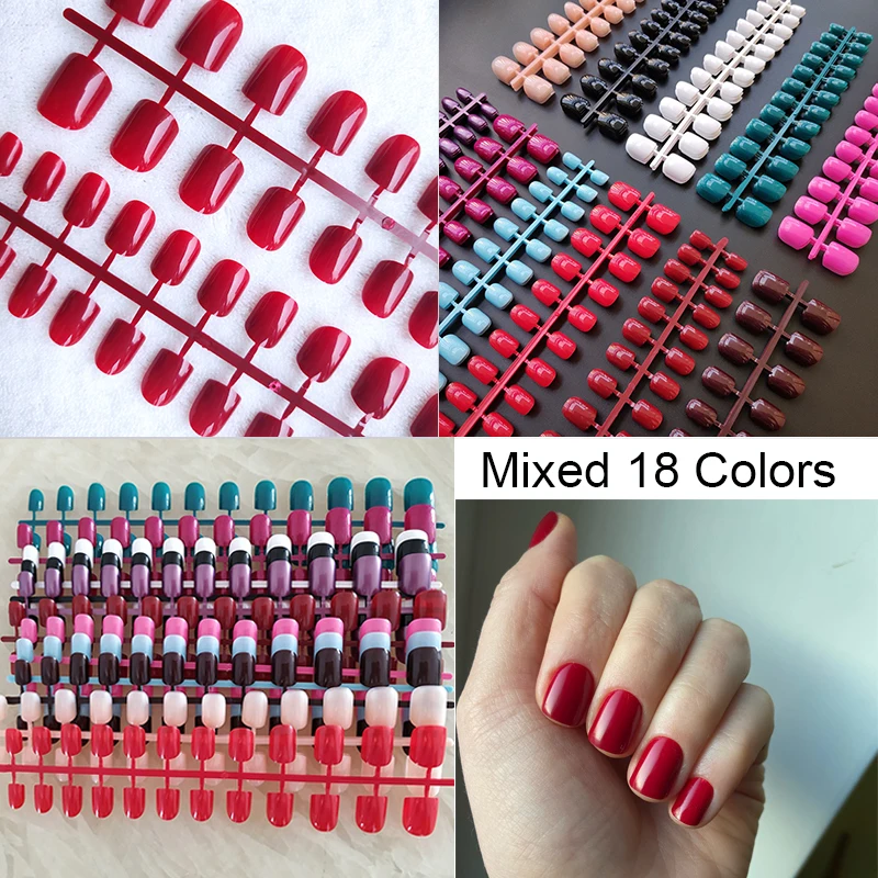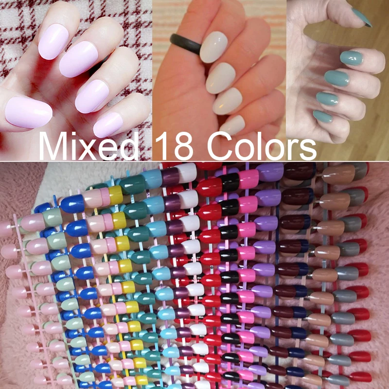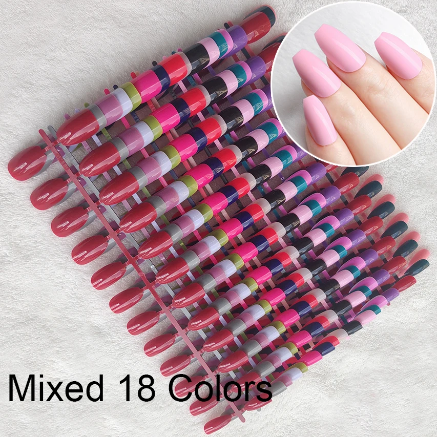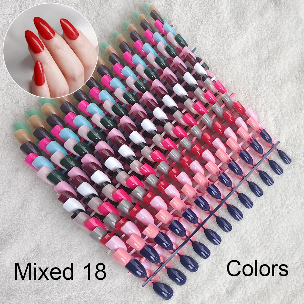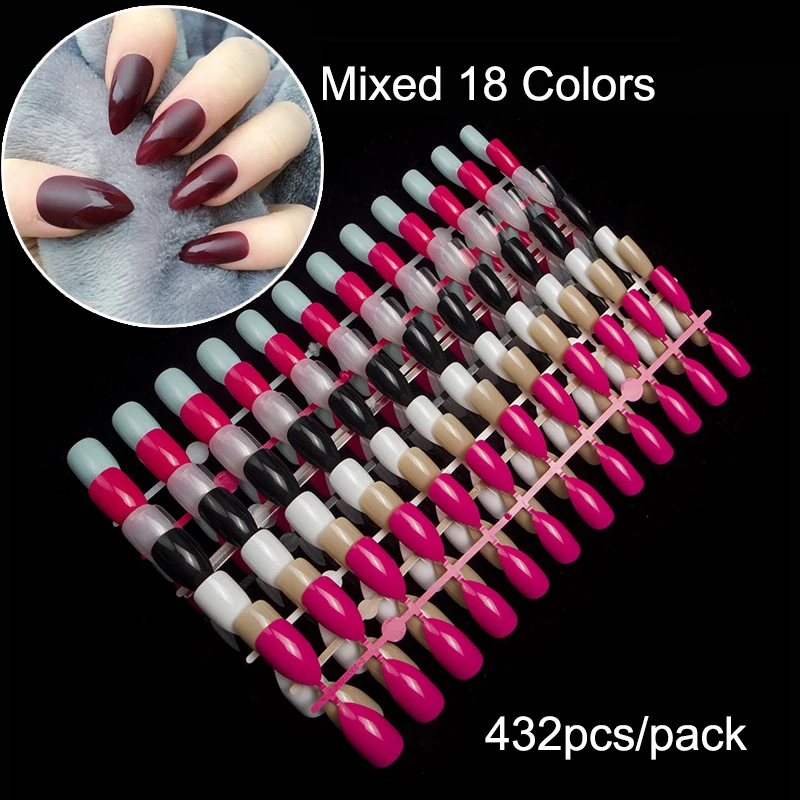 Накладные ногти на шпильке, 18 цветов, 432 шт.упак., разноцветные, с миндалевидным напылением, акриловые, с острым концом, Типсы для искусства ногтей