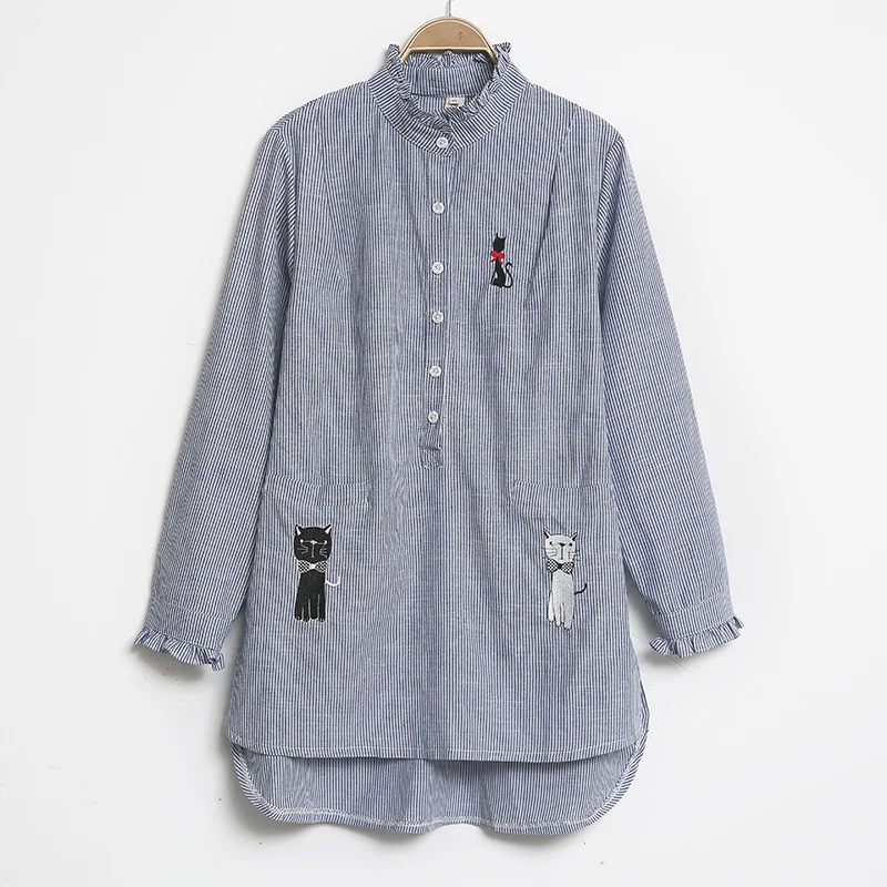 Женская рубашка с вышивкой в полоску, Повседневная Блузка с воротником-стойкой и длинными рукавами, размера плюс
