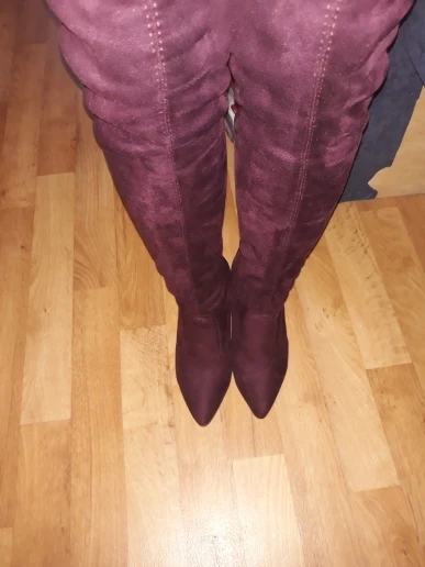 Сапоги отличные! Кто не хочет носить выше колена, можно сделать голенище гармошкой. Тоже отлично смотрится! Цвет глубокое бордо. Как красное вино, даже чуть темнее. По размеру, я взяла 24 на стопу 24,3 набо было Брать 24,5. Немного впритык. Если есть косточка точно берите чуть больше. Каблук хороший, удобный, главное чтоб было по размеру.