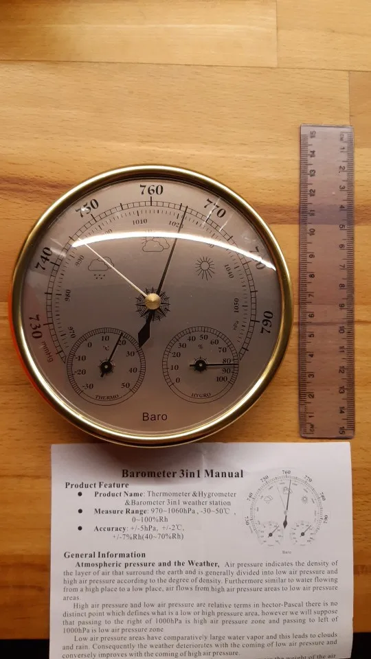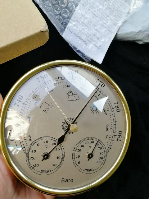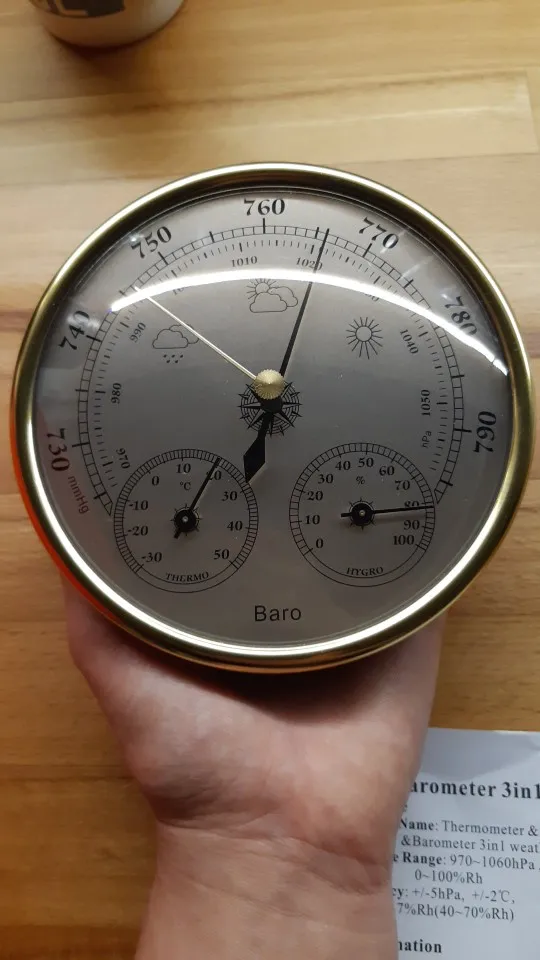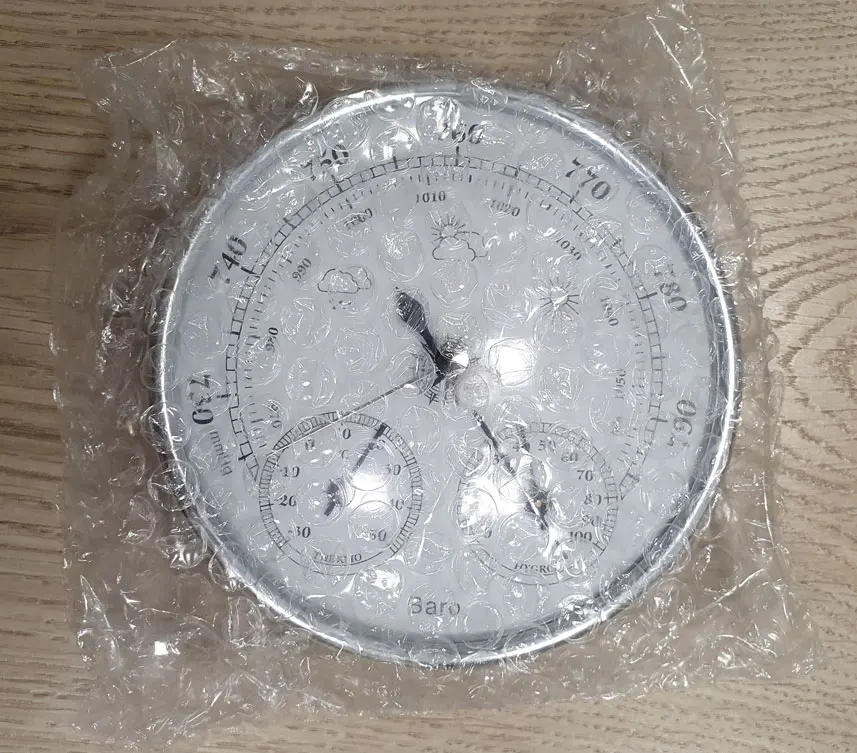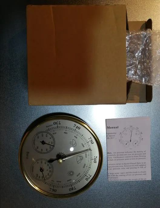 Упакован в пупырку и картонную коробку. Инструкция на английском и в ней нет инфы про регулировку температуры и влажности, в комментариях читал что она есть. Точность неизвестна, погрешность измерений указана сильная так что по своим ощущениям можно не хуже измерять, все три стрелки двигаются при изменении условий. Короче ИМХО пустая трата денег, изменение давления и погоды с таким же успехом и % можно посмотреть в интернете. Ощущения дешёвой игрушки от пластика, веса и сборки. Ну и цена тоже как бы не метеостанции.