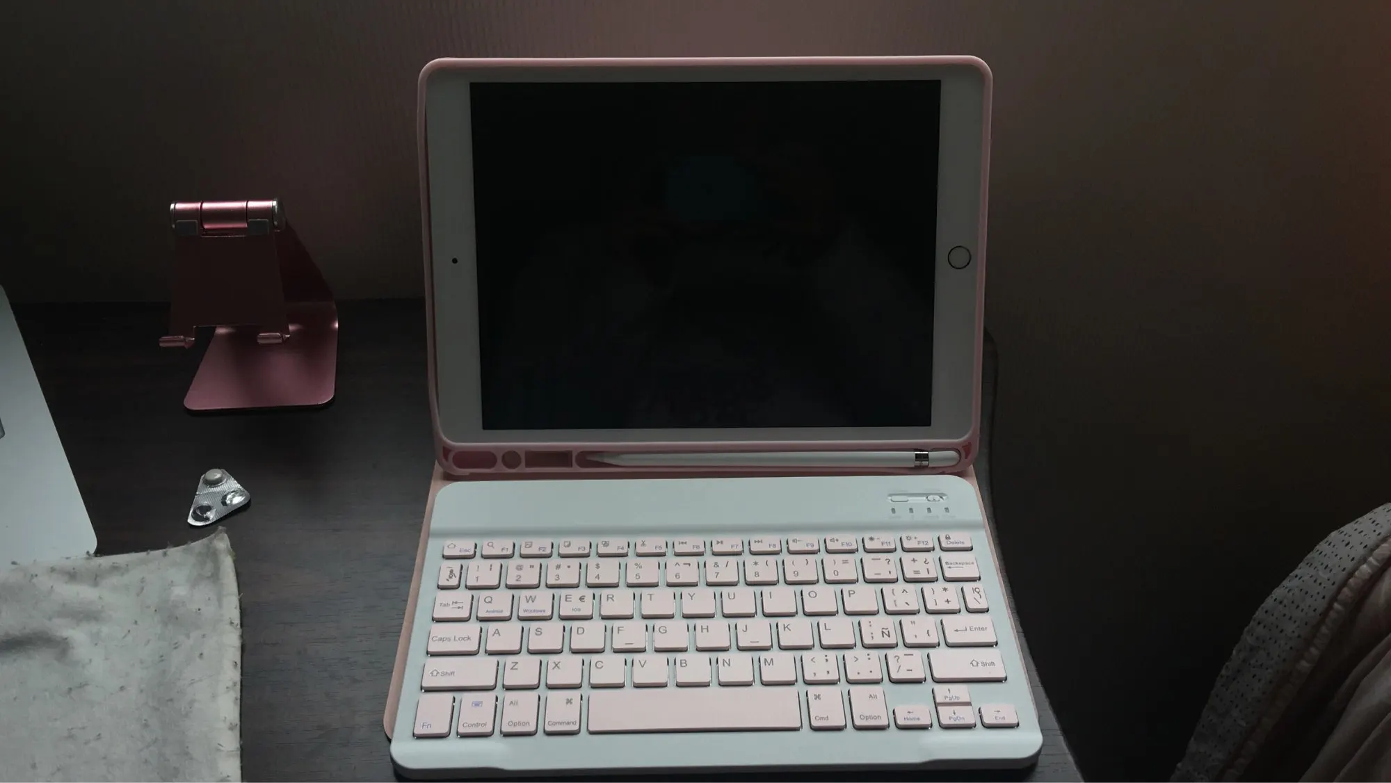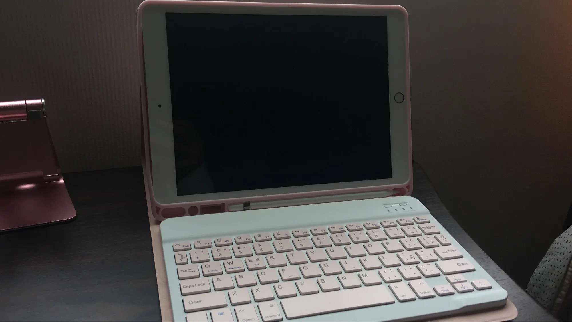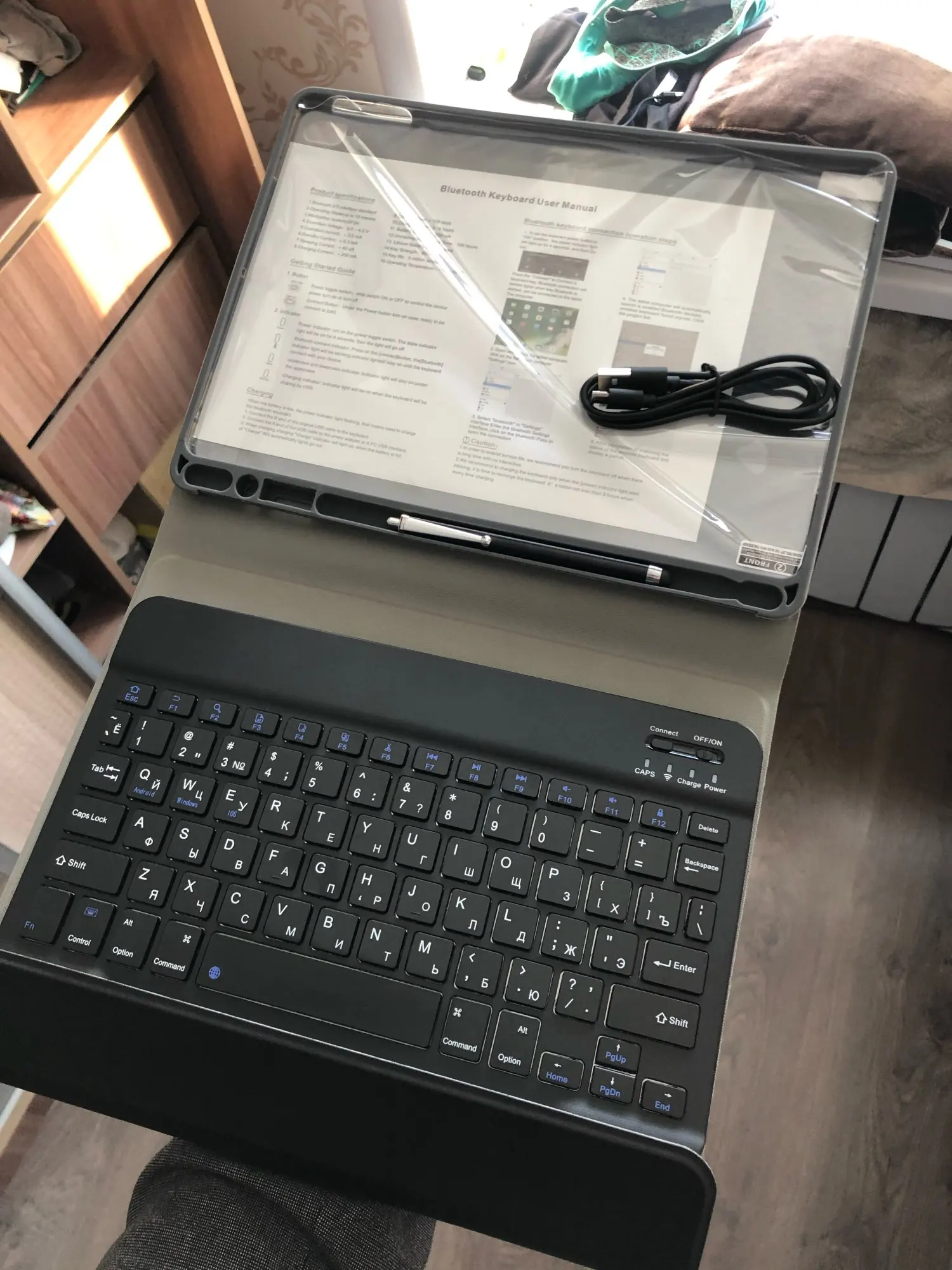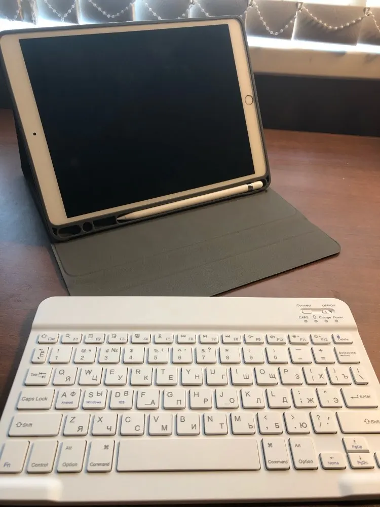 Клавиатура работает довольно хорошо, поставляется с кабелем для зарядки, инструкциями и изогнутой сенсорной ручкой. У меня не было проблем с клавиатурой. Единственное плохое в том, что зазор для карандаша Apple очень свободный и падает.