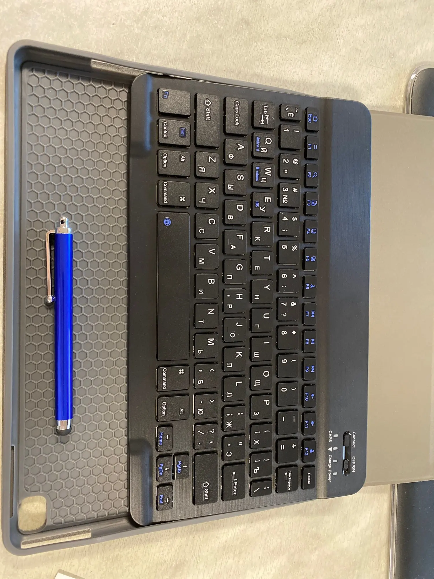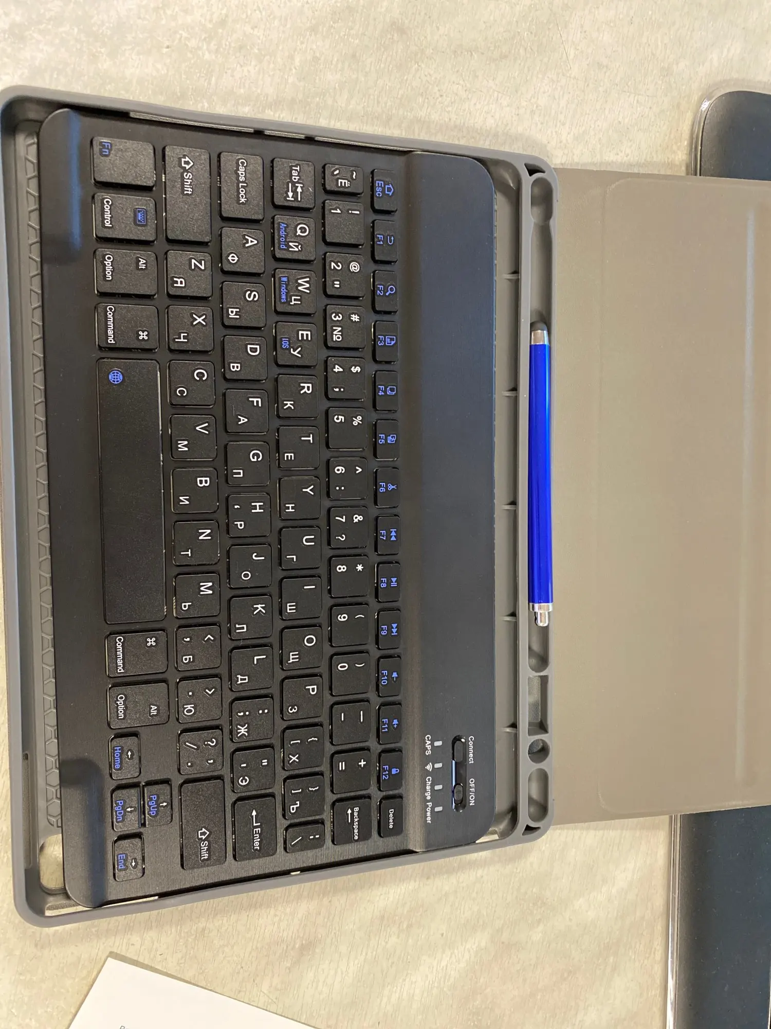 Прекрасно работает, подключается через bluetooth к любому устройству, Я примерил его с помощью планшета Samsung и сотового телефона Samsung, и он отлично работает. Чтобы изменить языки, просто нажмите две кнопки. Он имеет те же функции, что и клавиатура ПК. Кроме того, дизайн очень приятный. Полностью рекомендовано