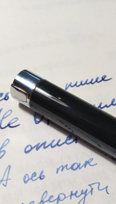 Пишет мягко. Несмотря на то, что перо 0,38 линия толстовата, те же дешманские пластмасски от Jinhao с такой же толщиной пера пишут тоньше. Жутко скользит в руке.