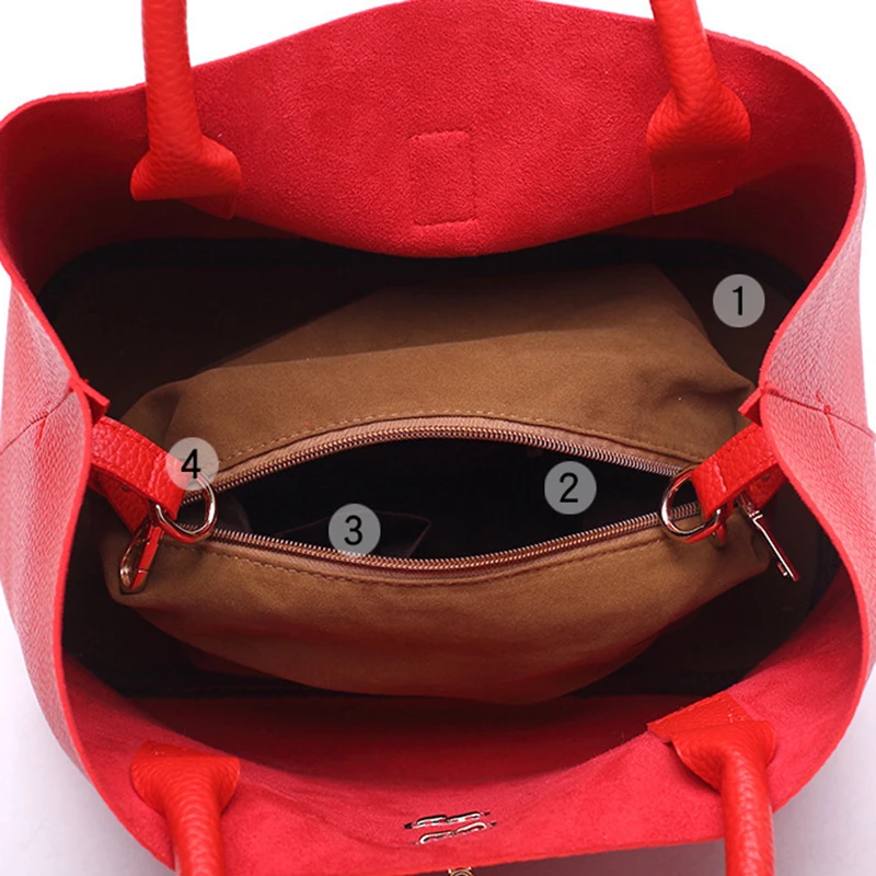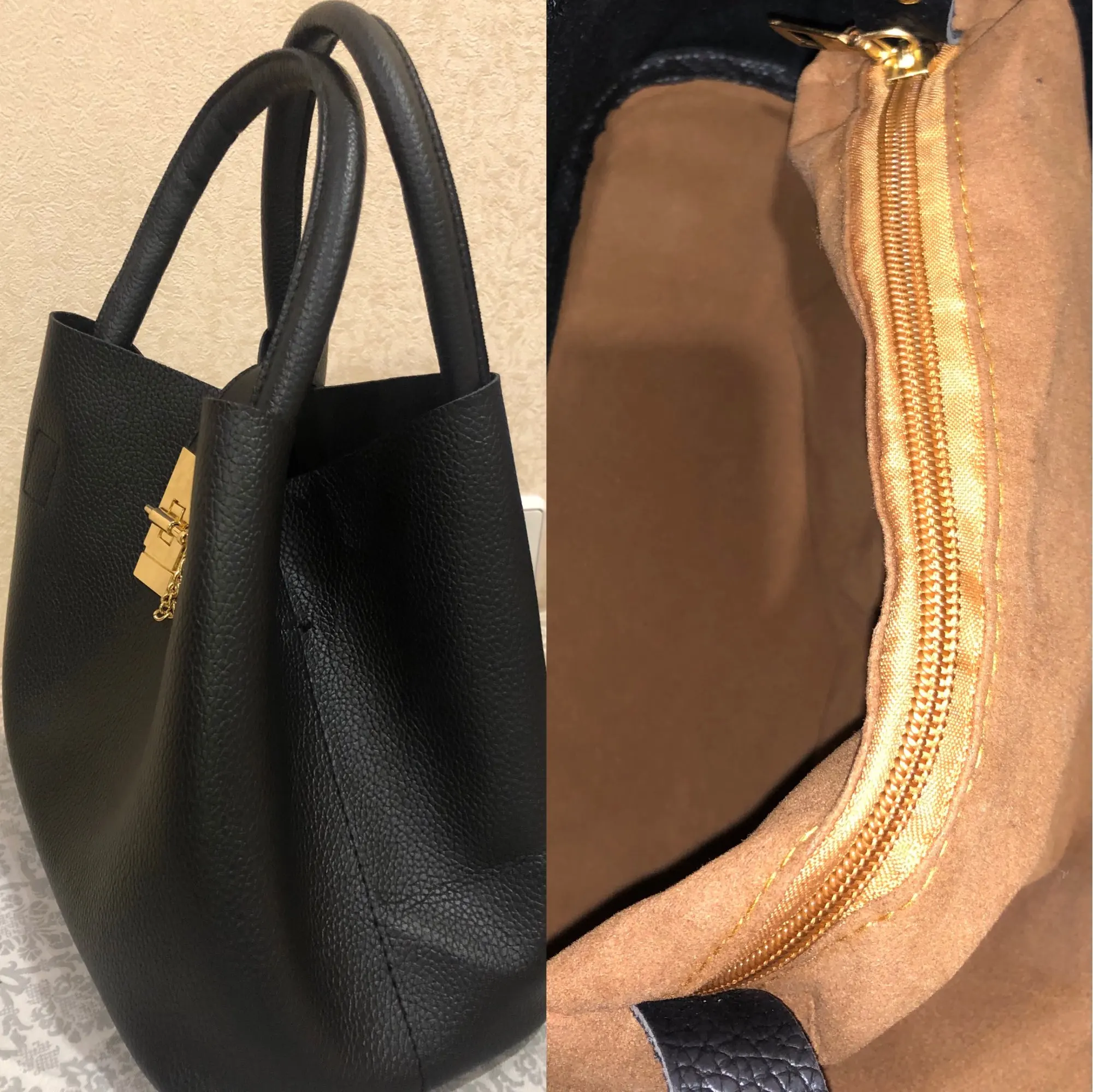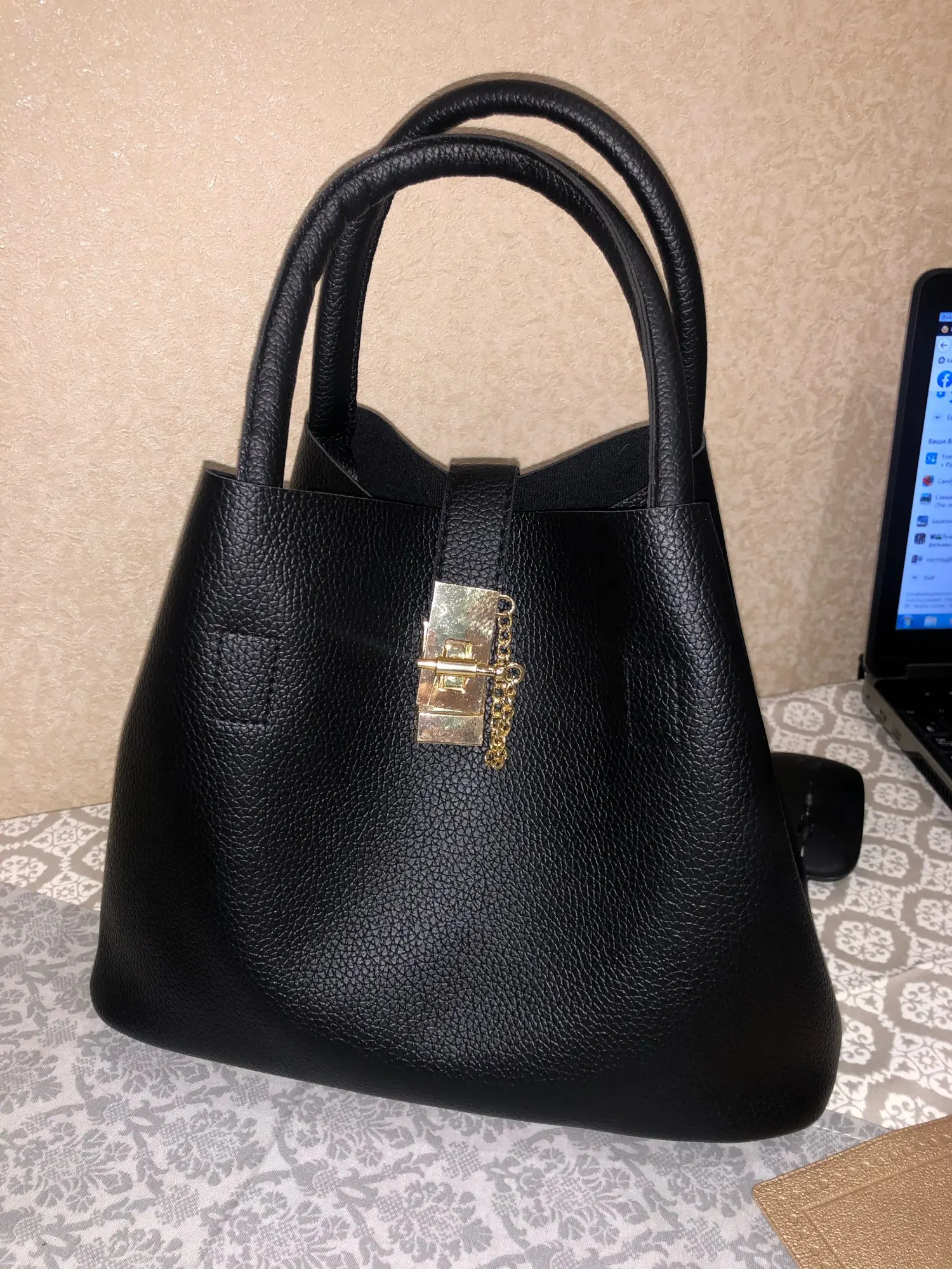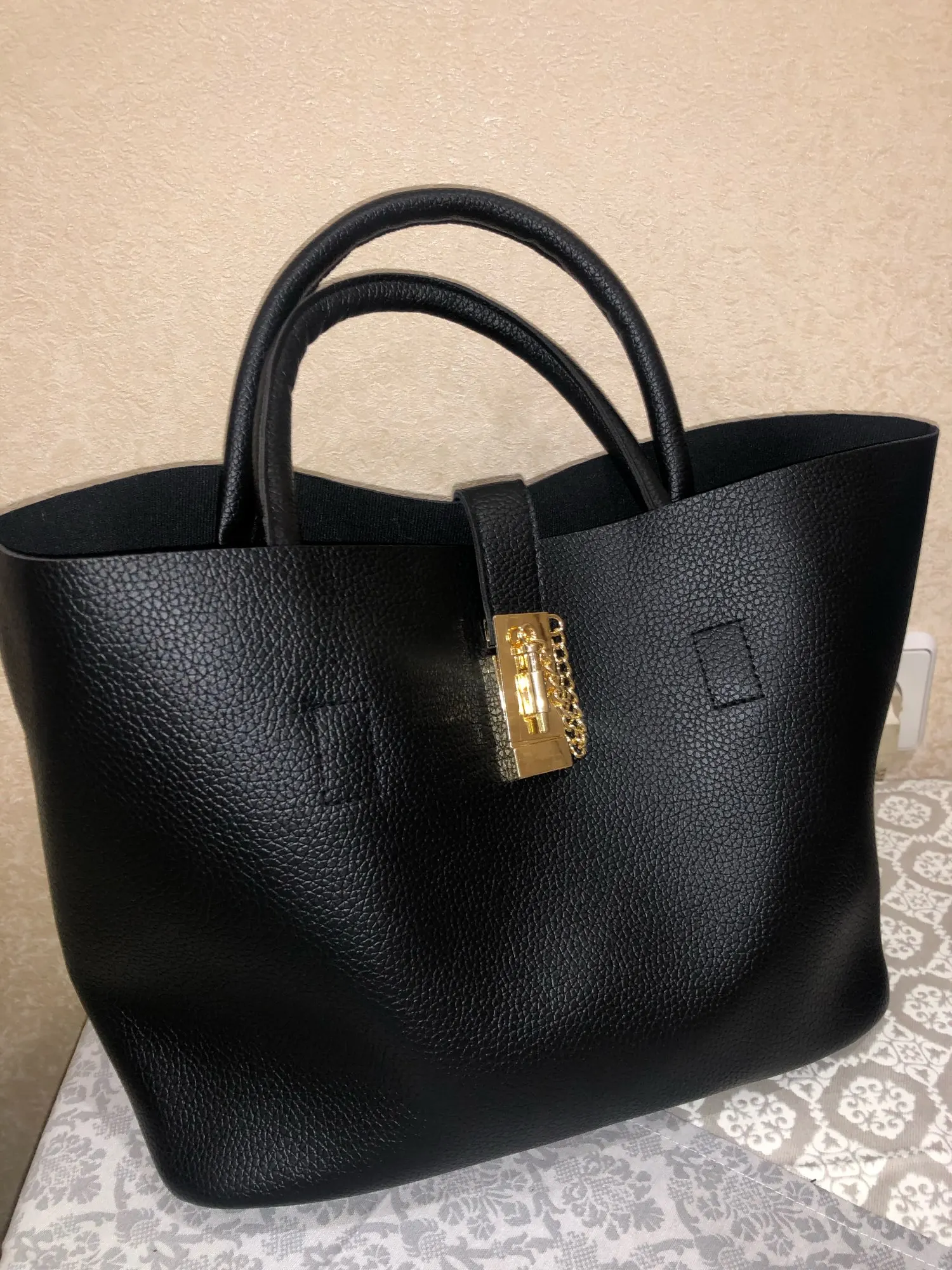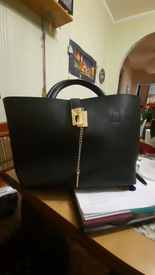 Сумка из кожзама, внутри вставляется что-то наподобие косметички. Пришла быстро, почти за неделю в пятёрочку возле дома. Был поцарапан замок, я открыла спор, и продавец вернул около 200 руб. Выглядит стильно и дорого. Брала за 930 руб.